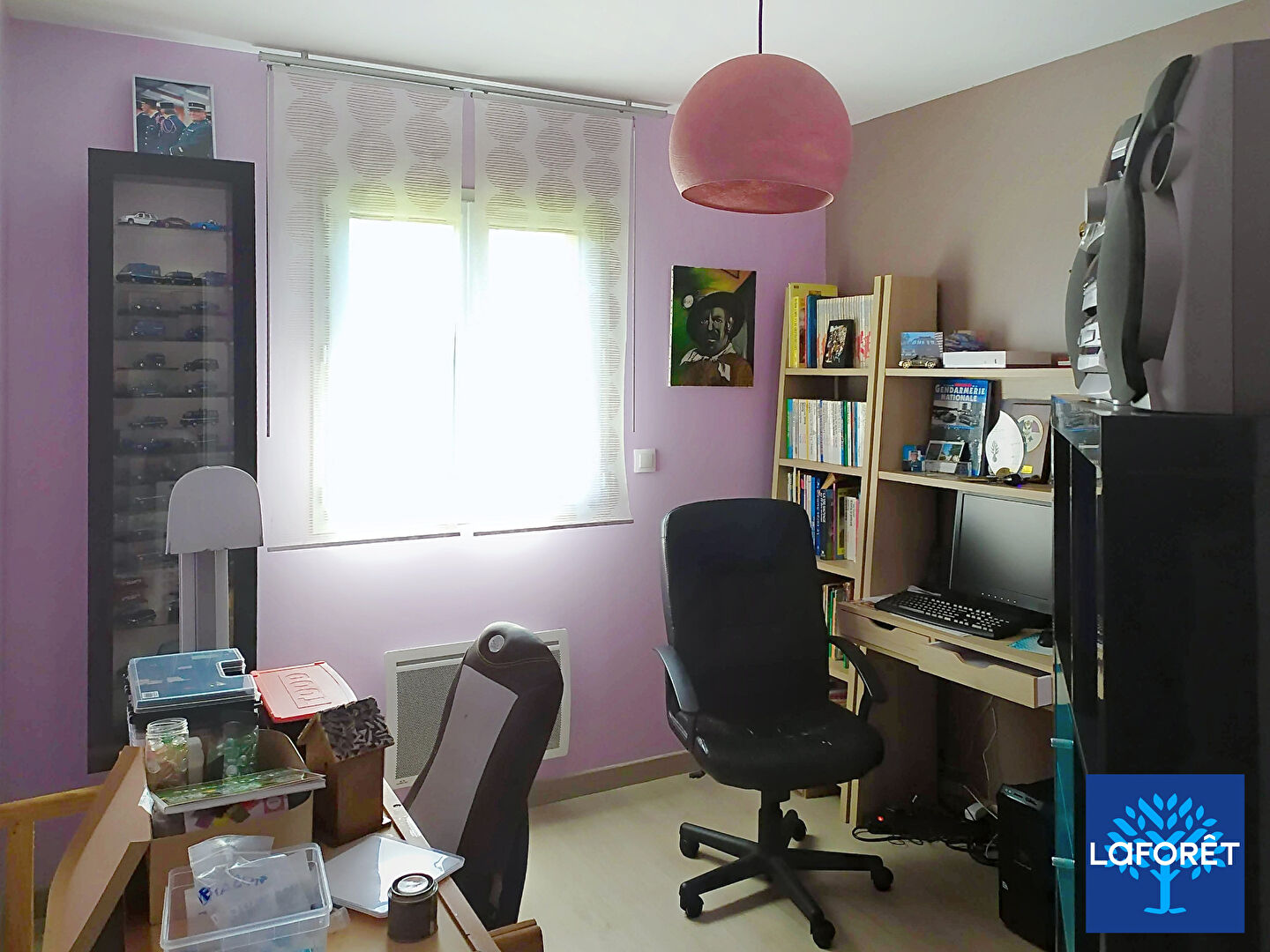 - Une entrée avec placard, une cuisine aménagée ouverte sur séjour avec poêle à granulés, un couloir desservant trois chambres et un bureau, une salle de bains avec douche et baignoire, un wc indépendant.