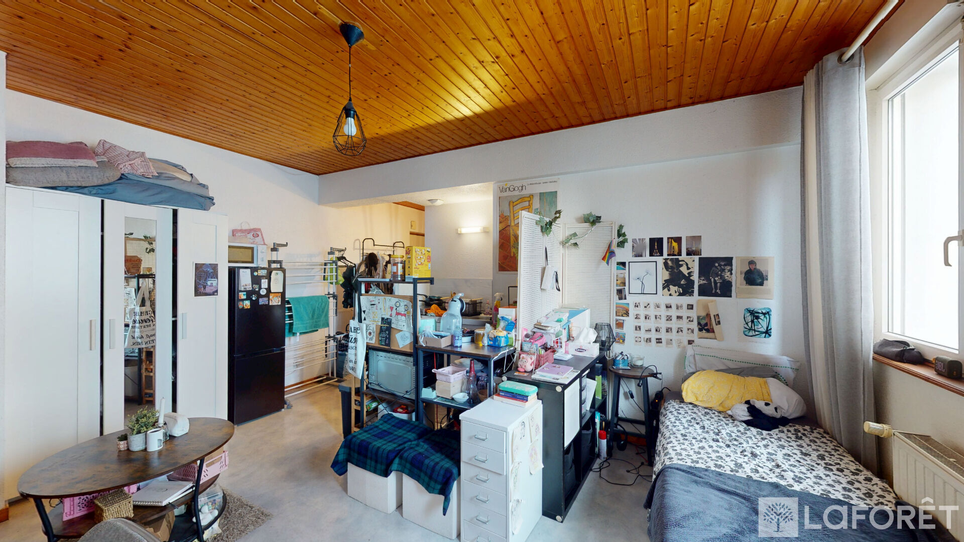Ce studio se compose d'une pièce de vie lumineuse avec espace nuit et coin salon, d'un coin cuisine fonctionnel et d'une salle d'eau avec WC. Il dispose également d'une cave, idéale pour le stockage, et l'immeuble est équipé d'un interphone pour plus de sécurité et de confort.