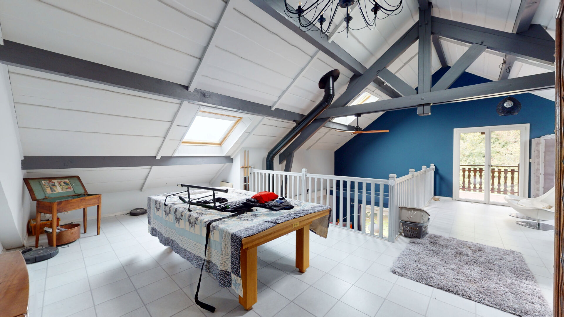 A l'étage une 3ème chambre, une grande mezzanine ouverte sur le séjour, aménagée en deux espaces distincts actuellement un espace billard et un autre salon TV. Ce dernier pouvant être imaginé en une chambre supplémentaire donnant accès sur un balcon couvert avec vue sur la forêt. Vous trouverez également sur cet étage une 2ème salle d'eau et un toilette séparé.