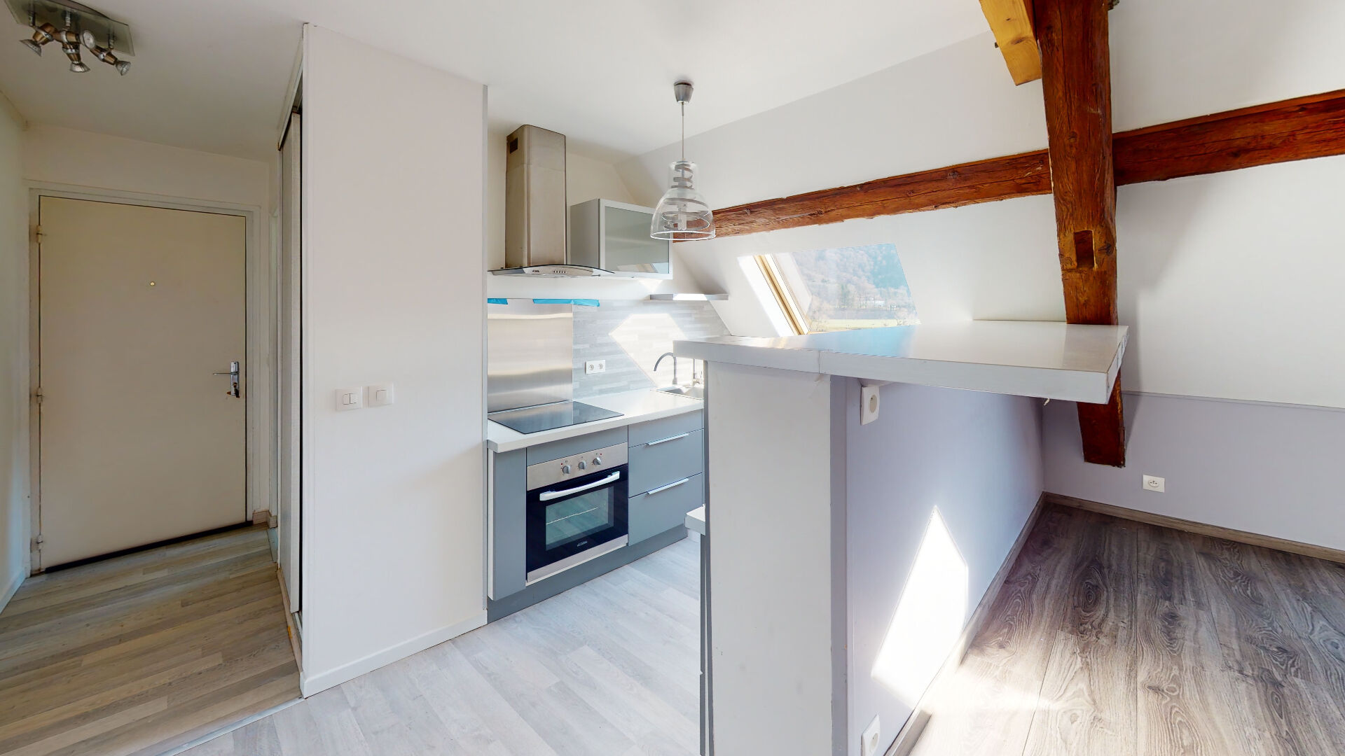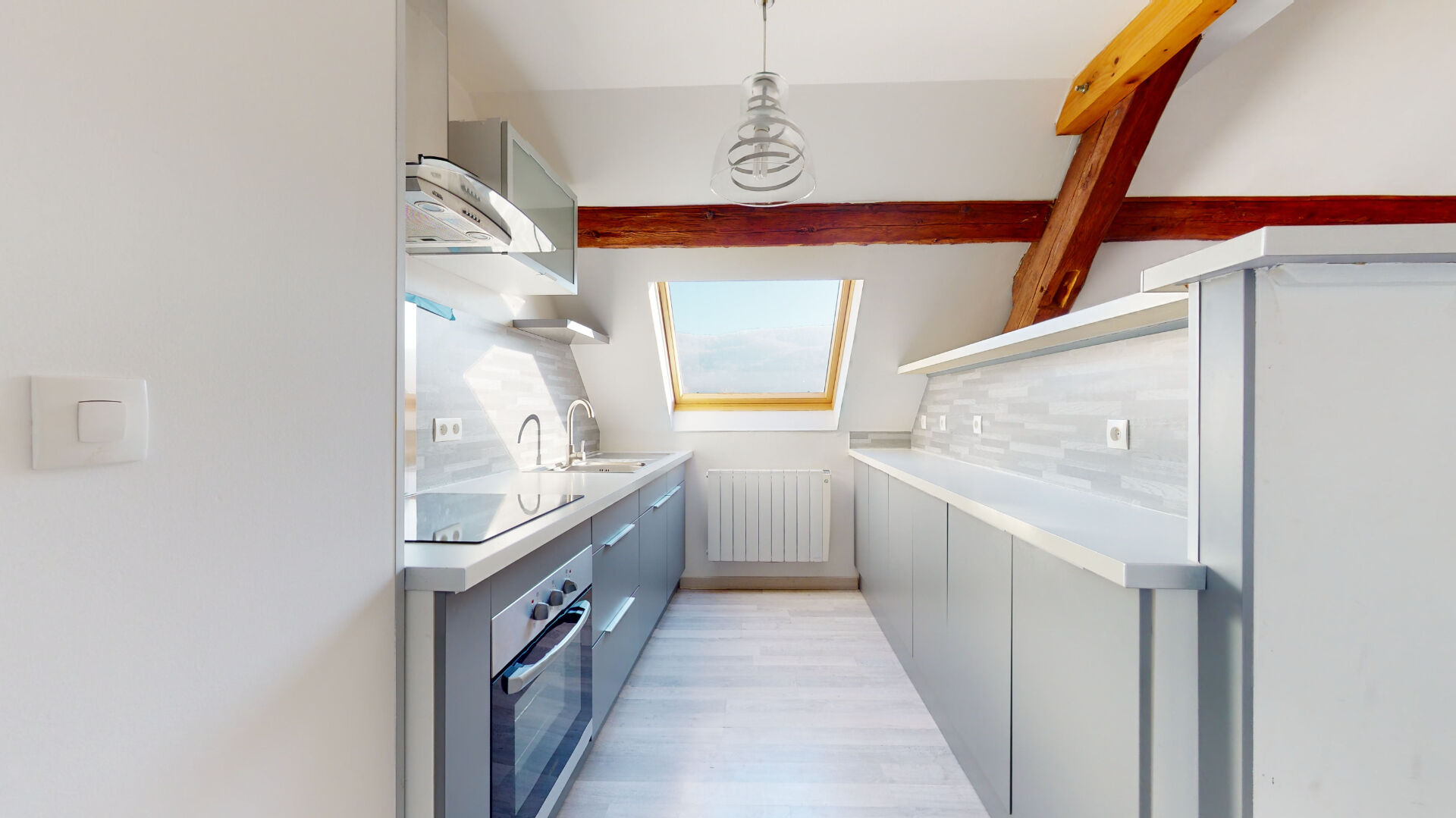 Il est composé d'une cuisine équipée (plaque de cuisson, hotte, four) ouverte sur le séjour, d'une chambre en mezzanine, d'une salle d'eau avec wc (ainsi que le branchement pour la machine à laver).