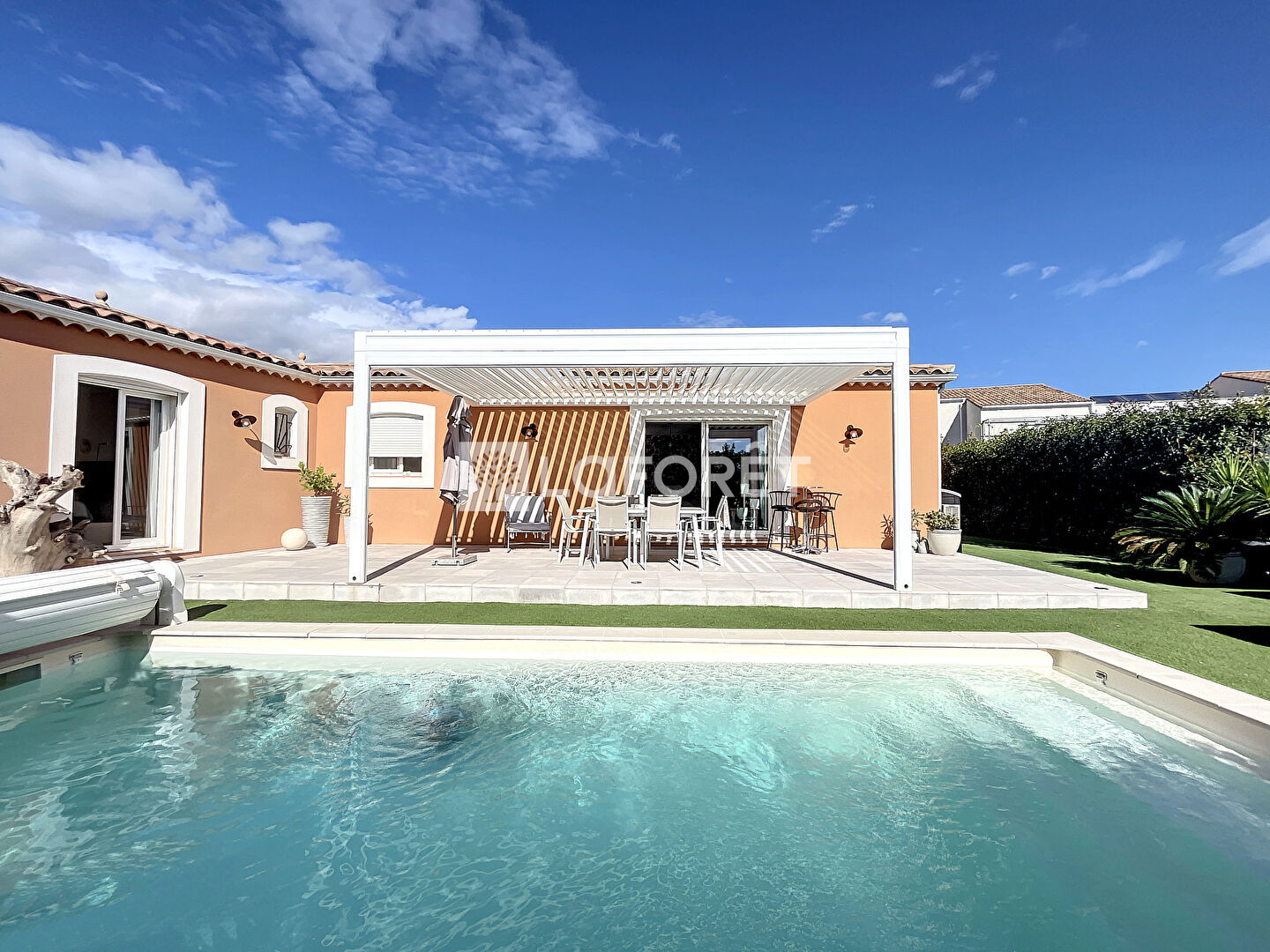 Elle vous offrira un vaste séjour avec cuisine ouverte d'environ 60m², ouvrant sur l'agréable jardin paysagé avec sa piscine sans aucun vis-à-vis de 8x4 mètres avec volet roulant sécurisé et sa terrasse carrelée dotée d'une pergola bioclimatique. S'ajoutent à cela trois belles chambres dont une suite parentale, une salle d'eau, un WC séparé, un bureau ainsi qu'un garage carrelé d'environ 20m².