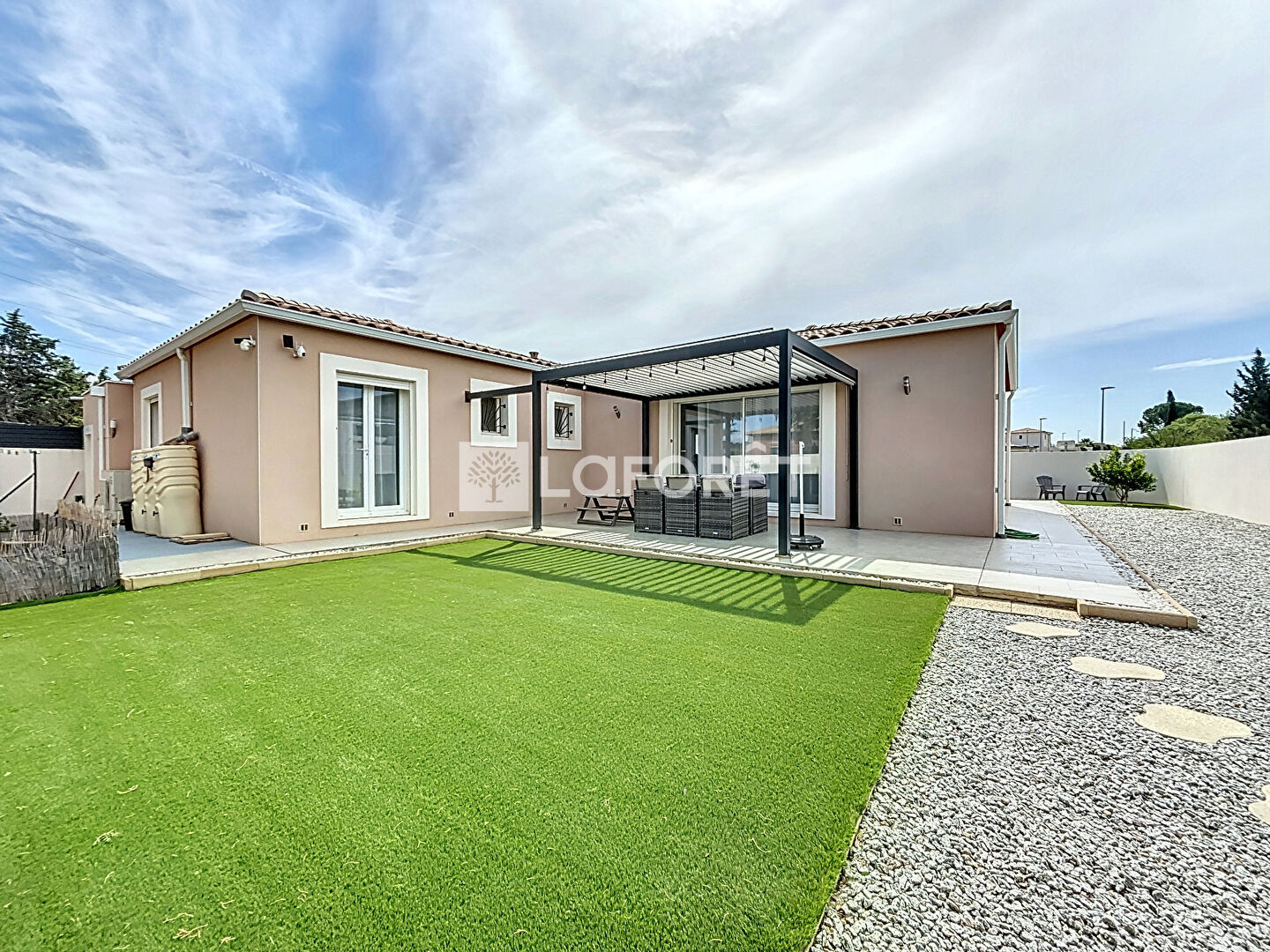 A l'extérieur, le jardin aménagé s'articule autour d'une première terrasse doté d'une pergola bioclimatique donnant sur le salon, et d'une seconde terrasse la salle à manger. Un espace couvert reste à aménager selon vos désirs.