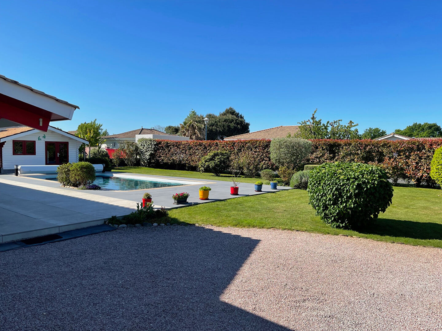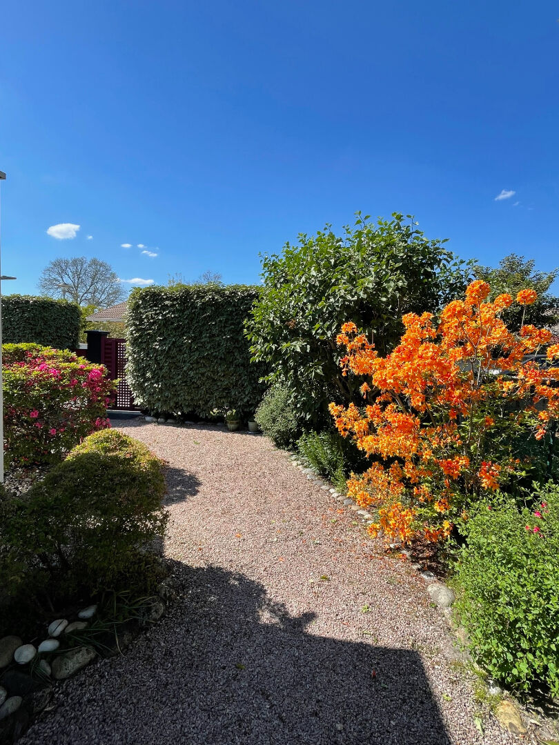 Profitez d'un jardin paysagé de 972 m² environ avec piscine, grande terrasse, un chalet de jardin idéal pour le rangement ou atelier.
