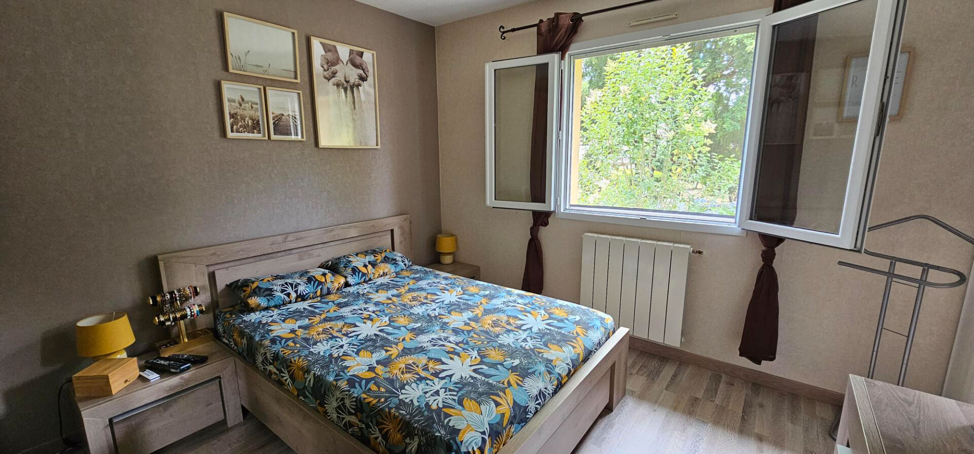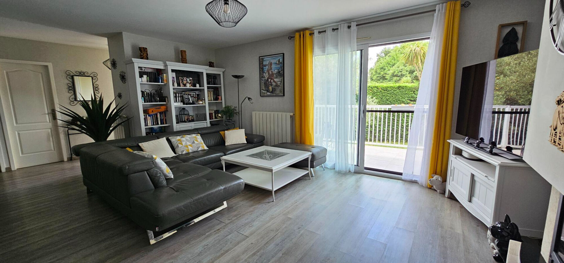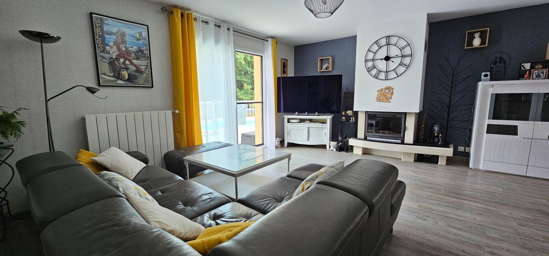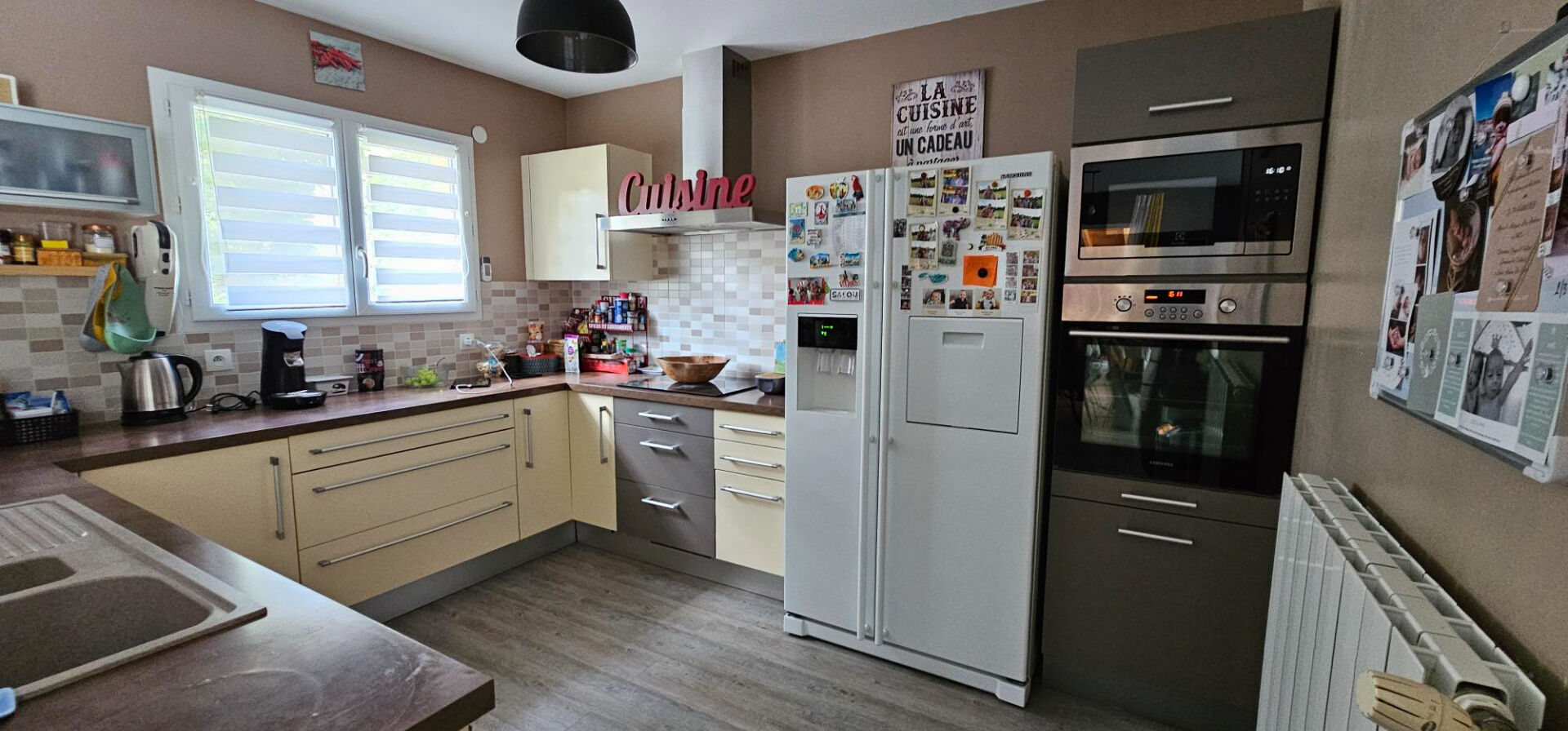 Entrée, salon, séjour de plus de 45 m² avec cheminée avec insert, cuisine américaine aménagée et équipée, véranda non chauffée, dégagement, 3 chambres dont une avec salle d'eau, nombreux rangements, wc indépendant.