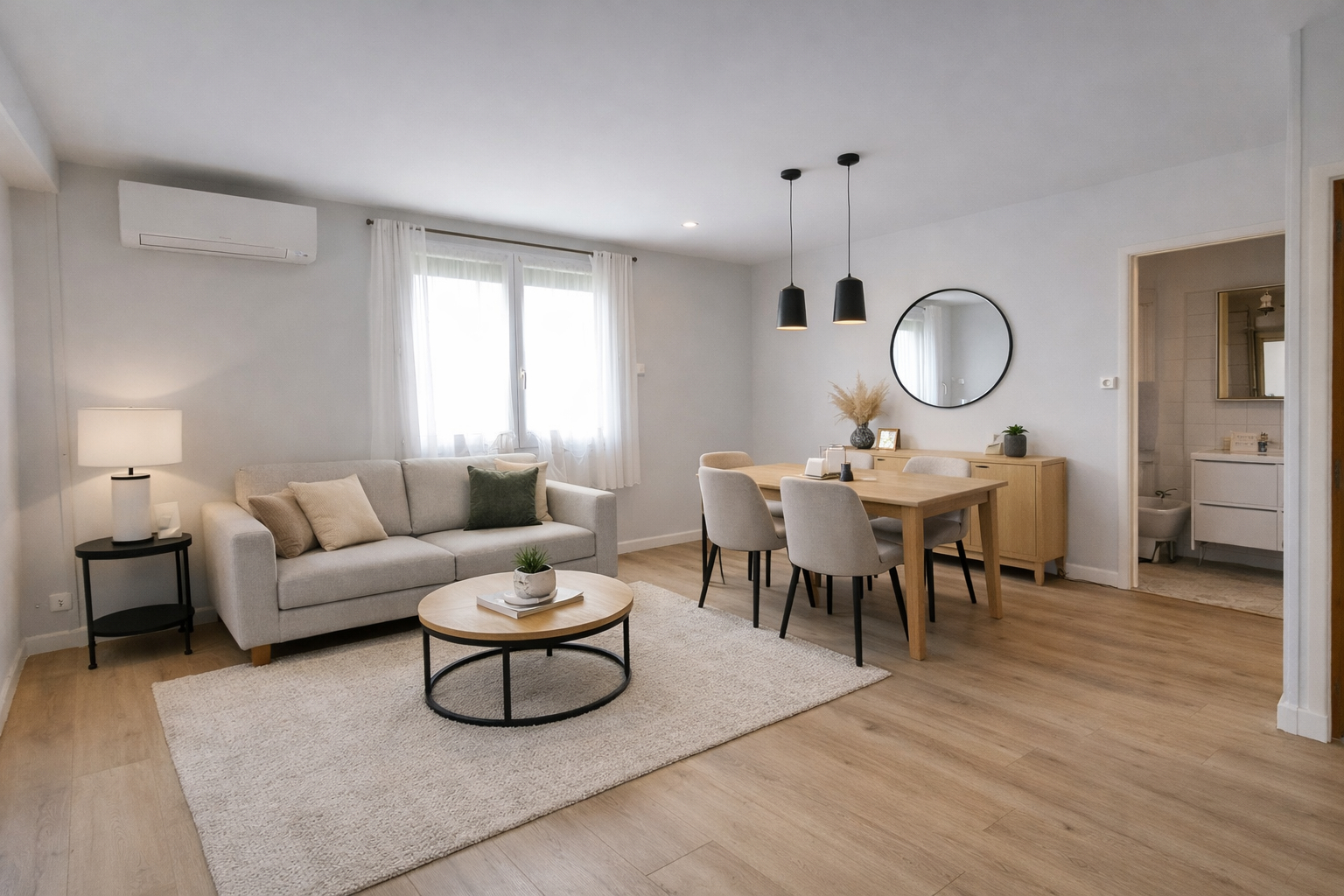 Menuiserie PVC double vitrage avec volets roulants électriques et climatisation réversible.