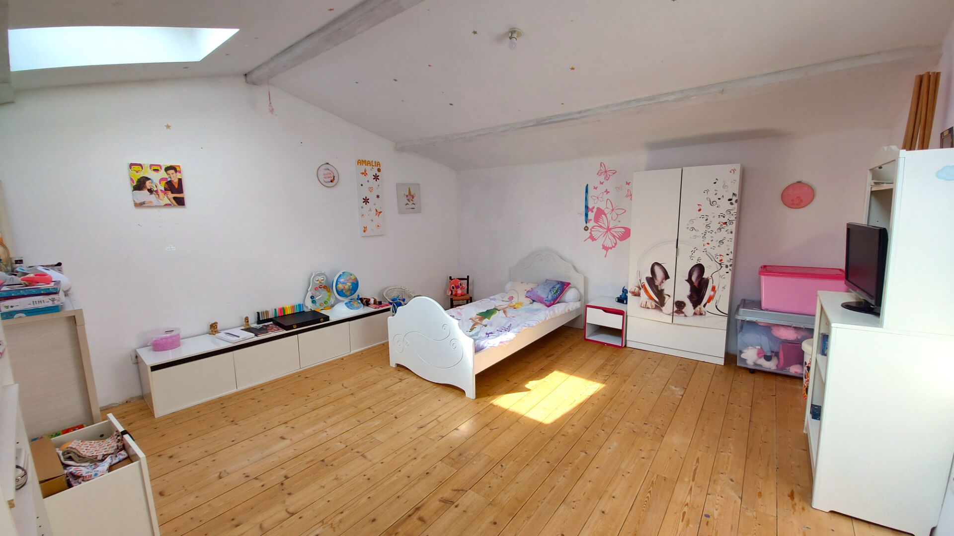A l'étage, une pièce palière climatisée pouvant servir de bureau, de salle de jeux ou facilement transformable en chambre sans gros travaux, ainsi qu'un couloir desservant 2 grandes chambres avec climatisation et une salle de bains avec baignoire d'angle, douche et double vasque.
