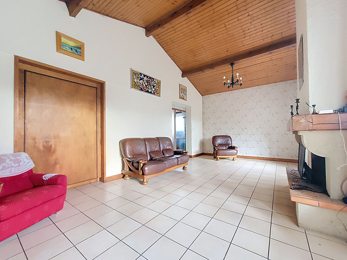 Séjour lumineux de 30 m² avec plafond cathédrale et cheminée insert