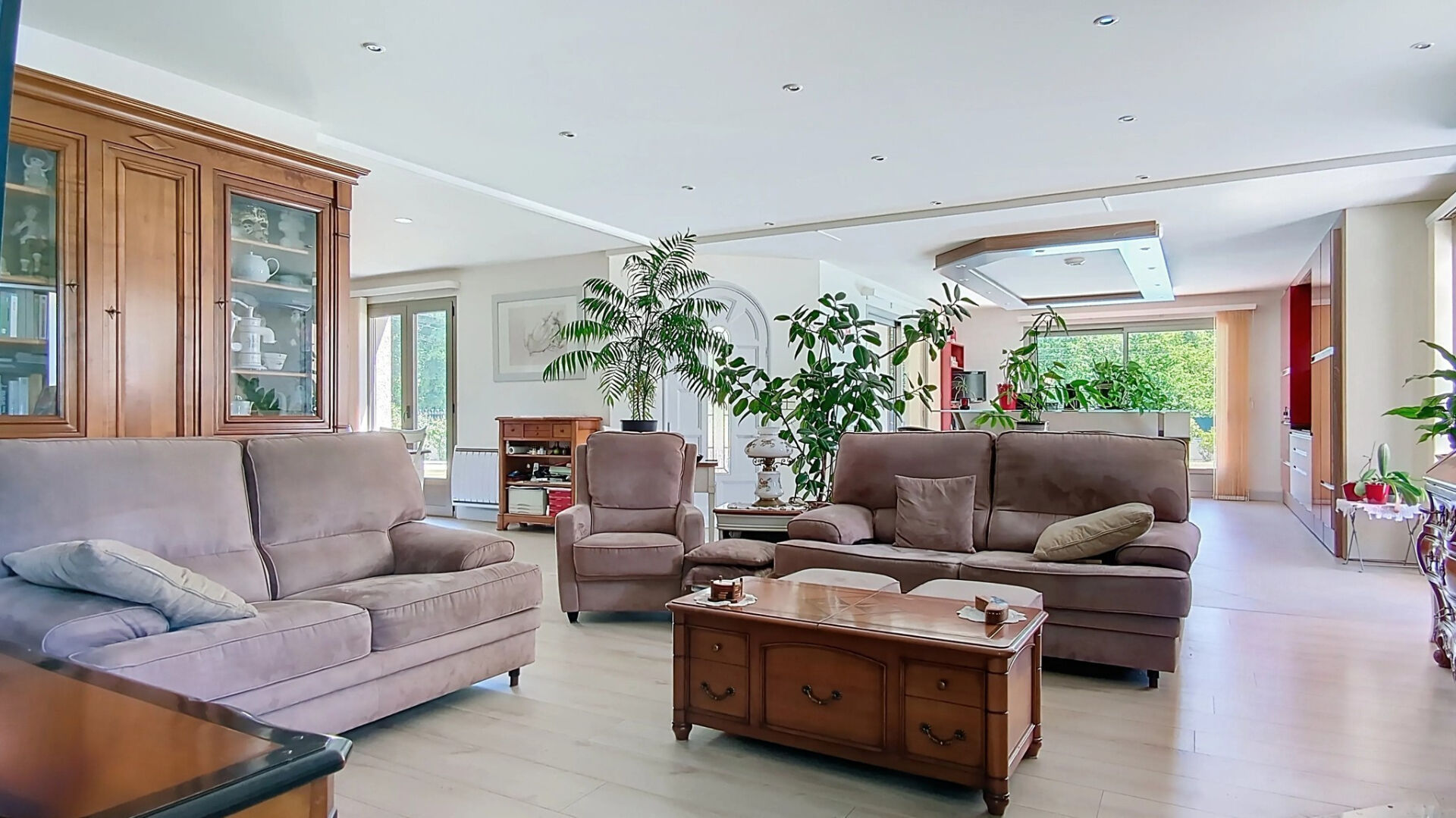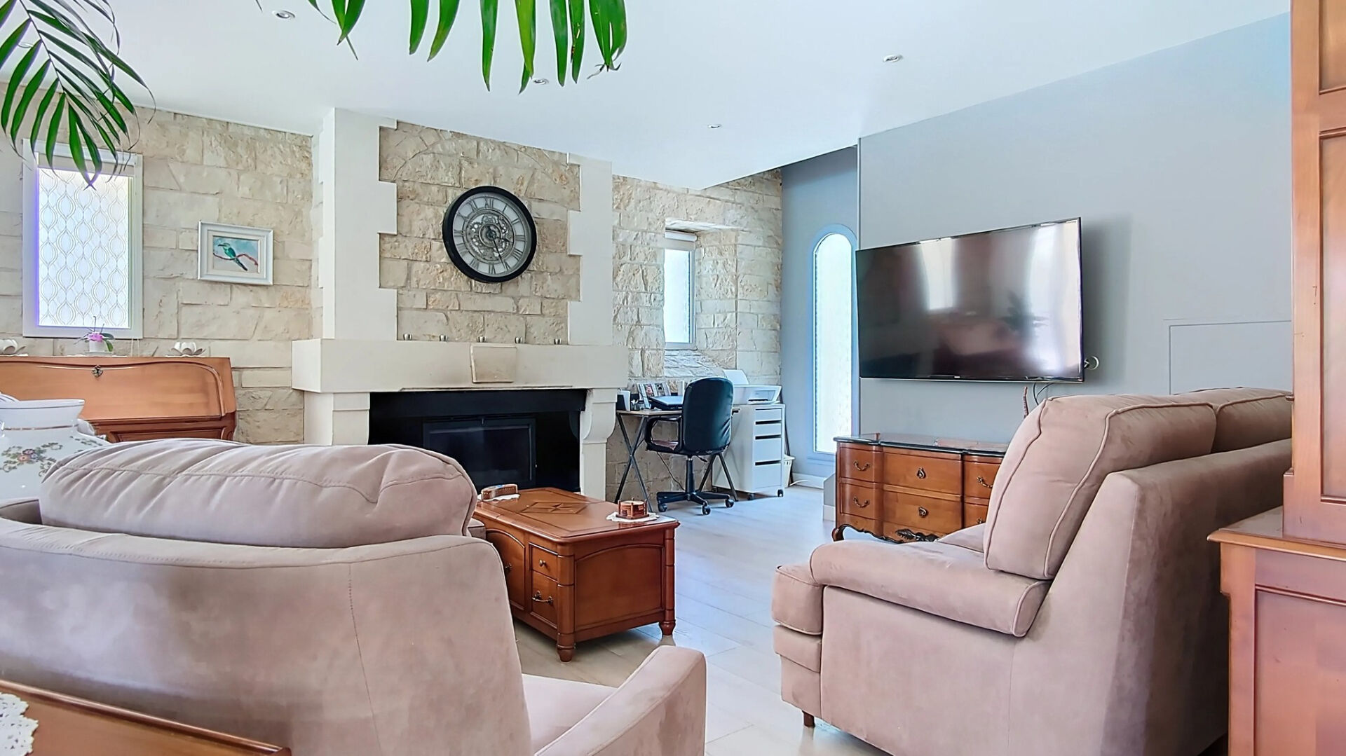 Dès l'entrée, la lumière naturelle met en valeur un vaste séjour avec cheminée insert en pierre et mur en pierre apparente, offrant une atmosphère chaleureuse et accueillante.