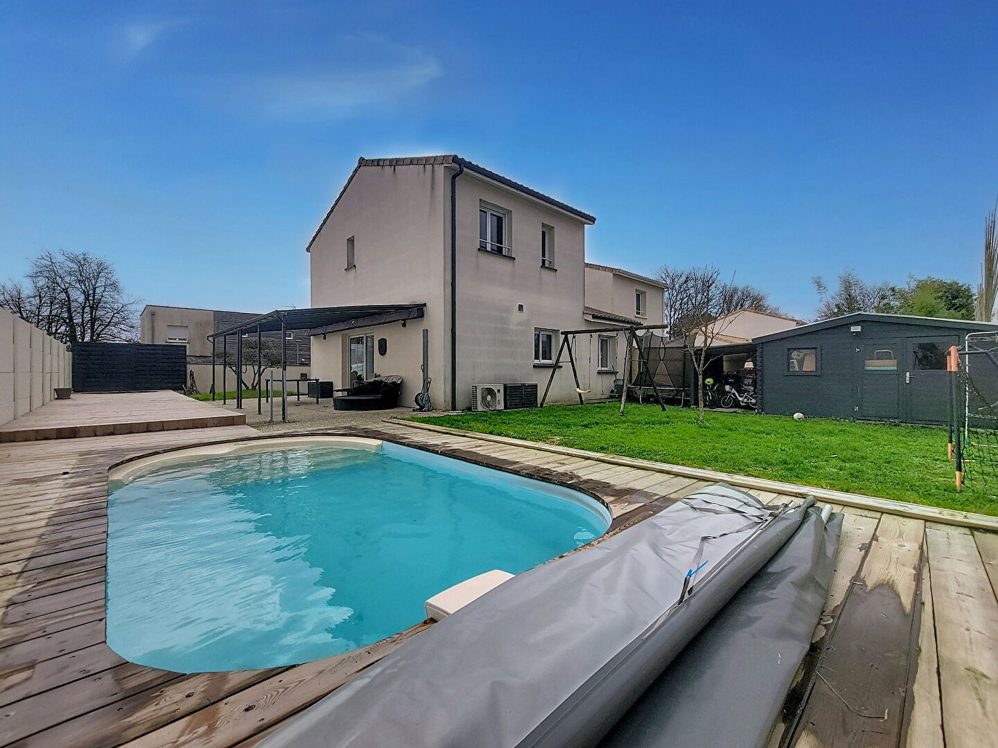À l'extérieur, vous profiterez pleinement des beaux jours avec sa première terrasse avec pergolas qui se prolonge sur une seconde en bois avec jacuzzi , deux abris.