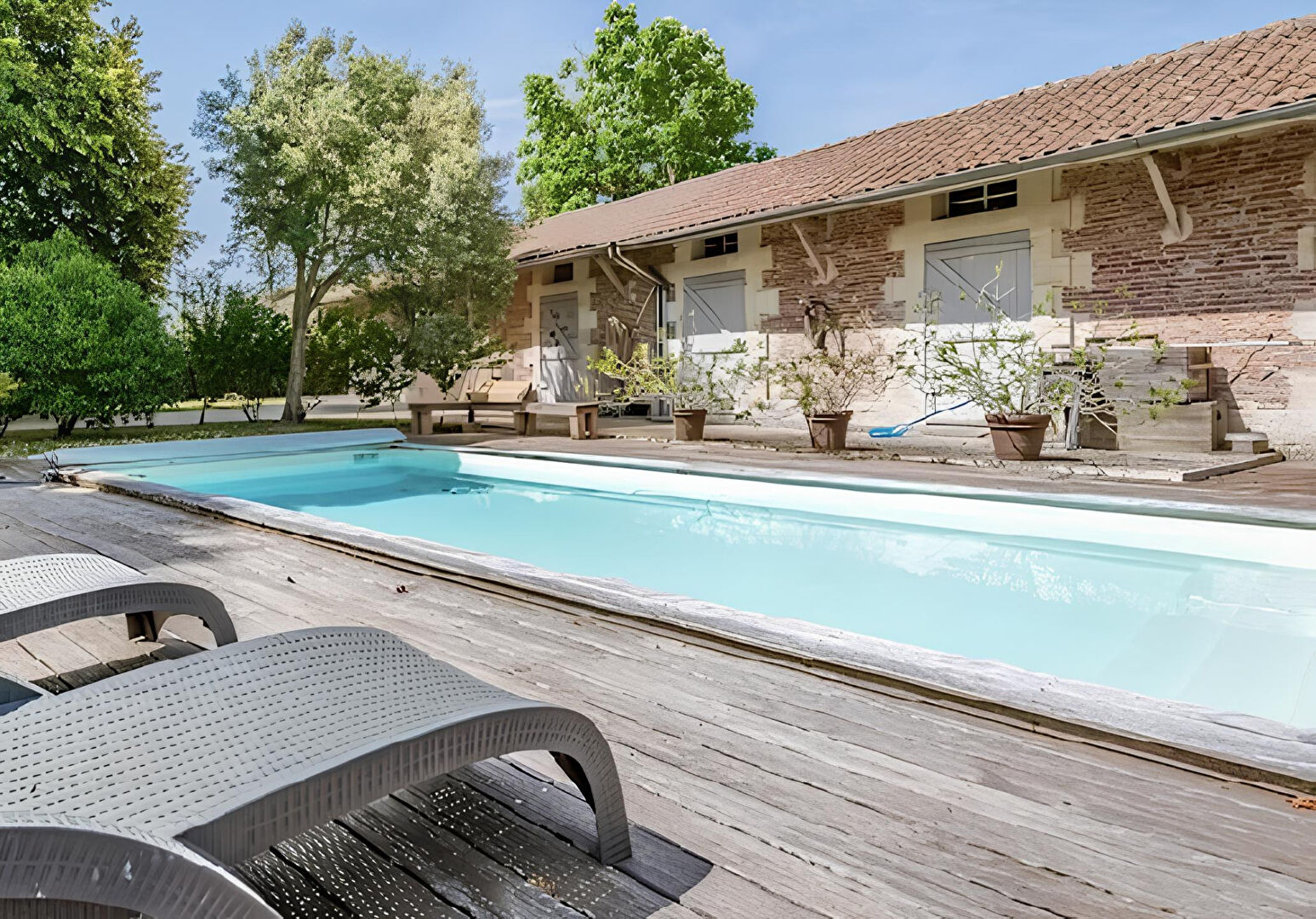 Un jardin paysager avec piscine (9x4) maçonnée traitement au sel et pompe chaleur, terrasse bois.