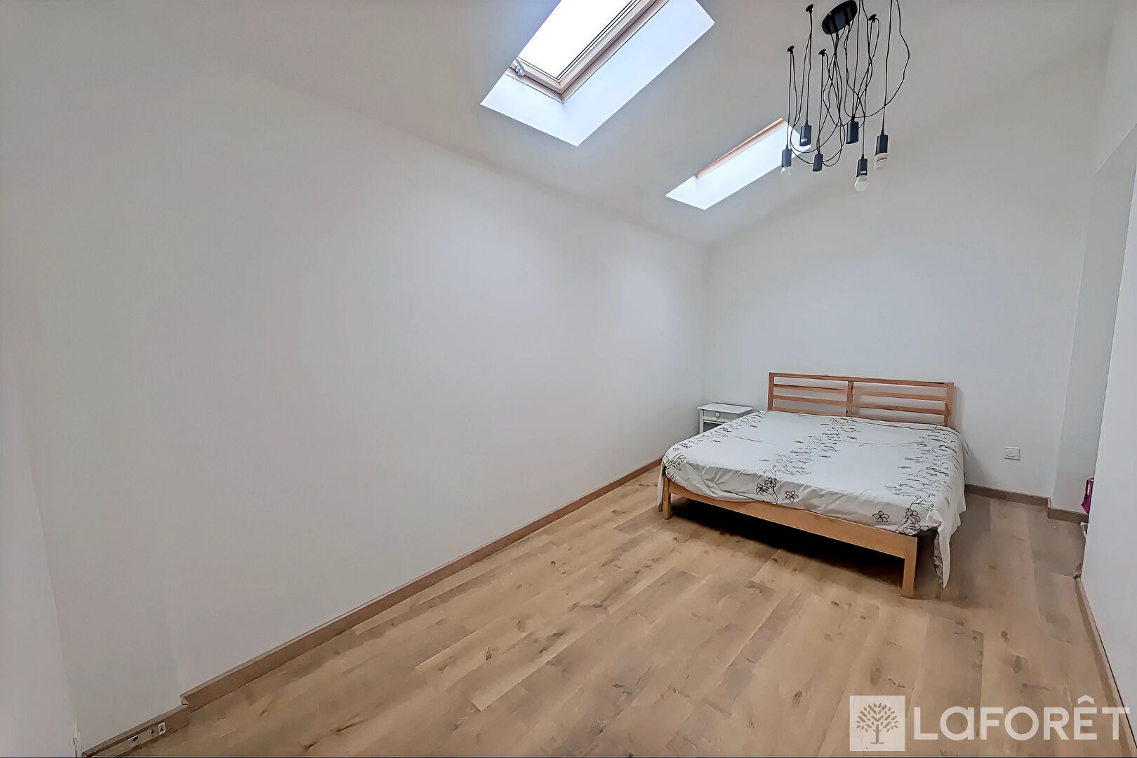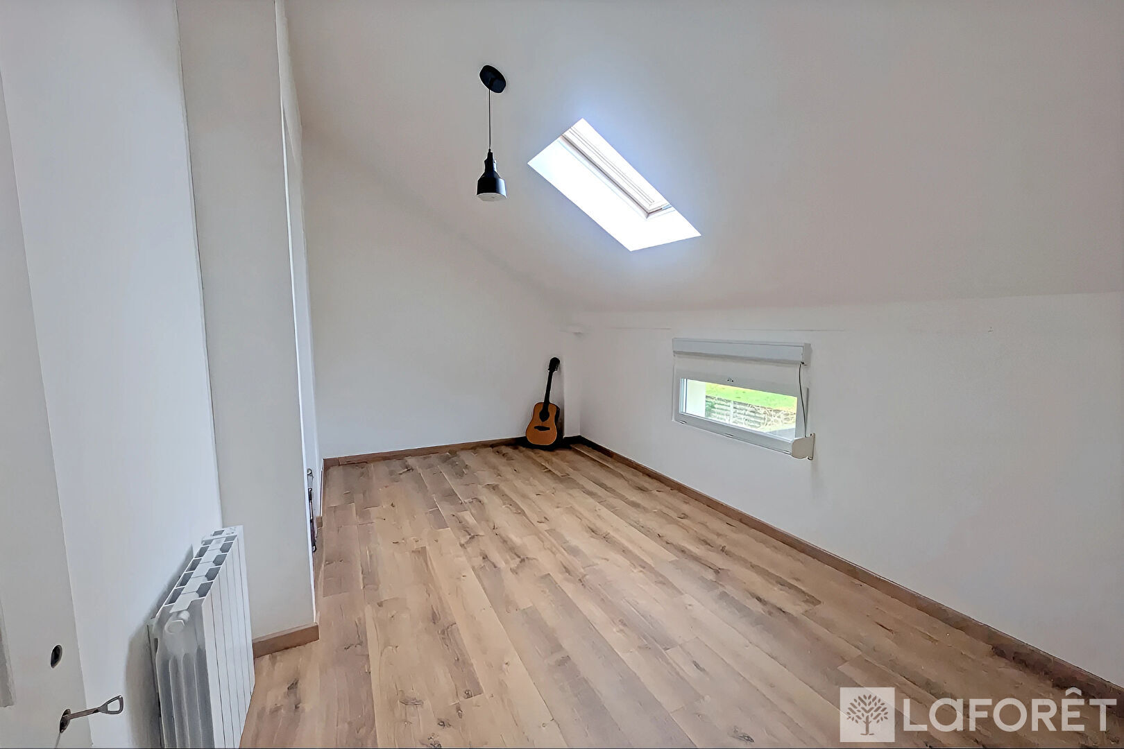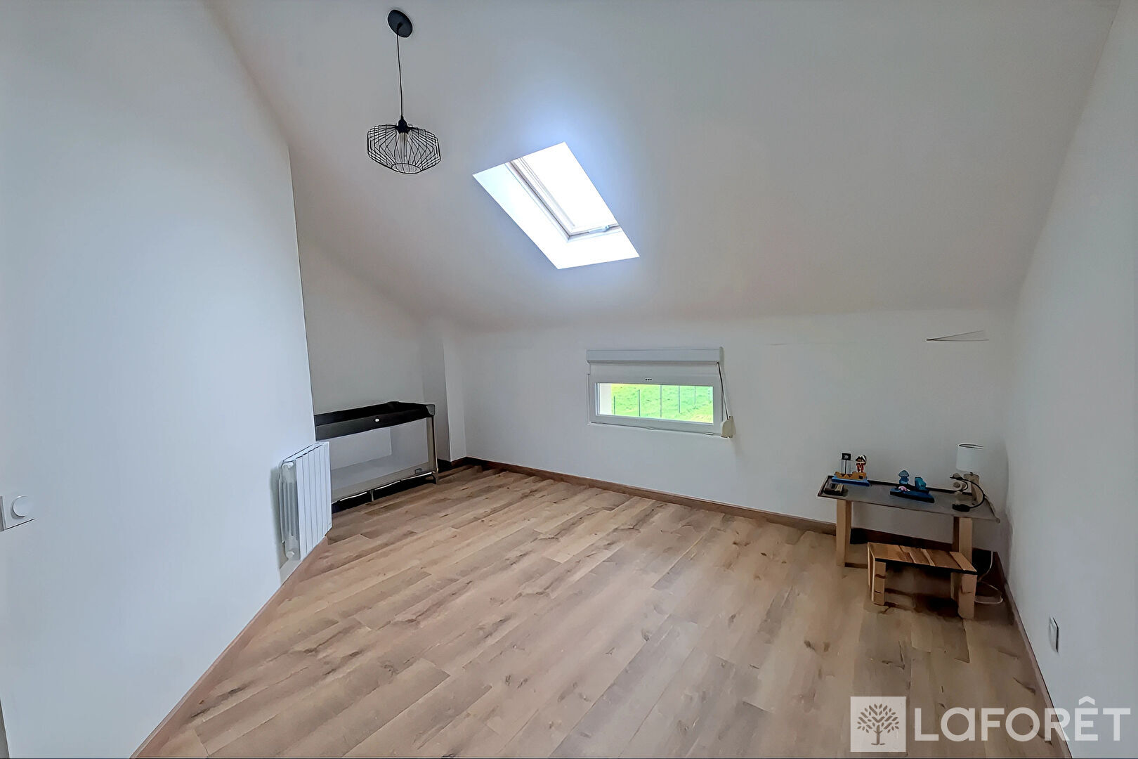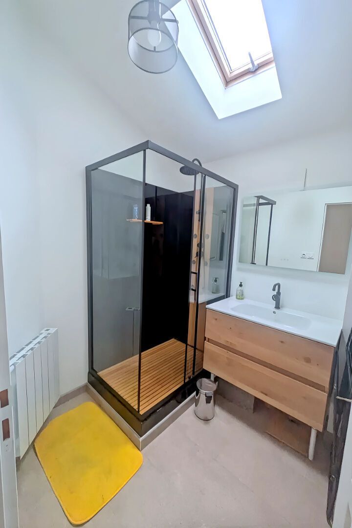 À l'étage, l'espace nuit se compose de trois chambres, dont des chambres mansardées avec fenêtres de toit, ainsi qu'une salle d'eau moderne.