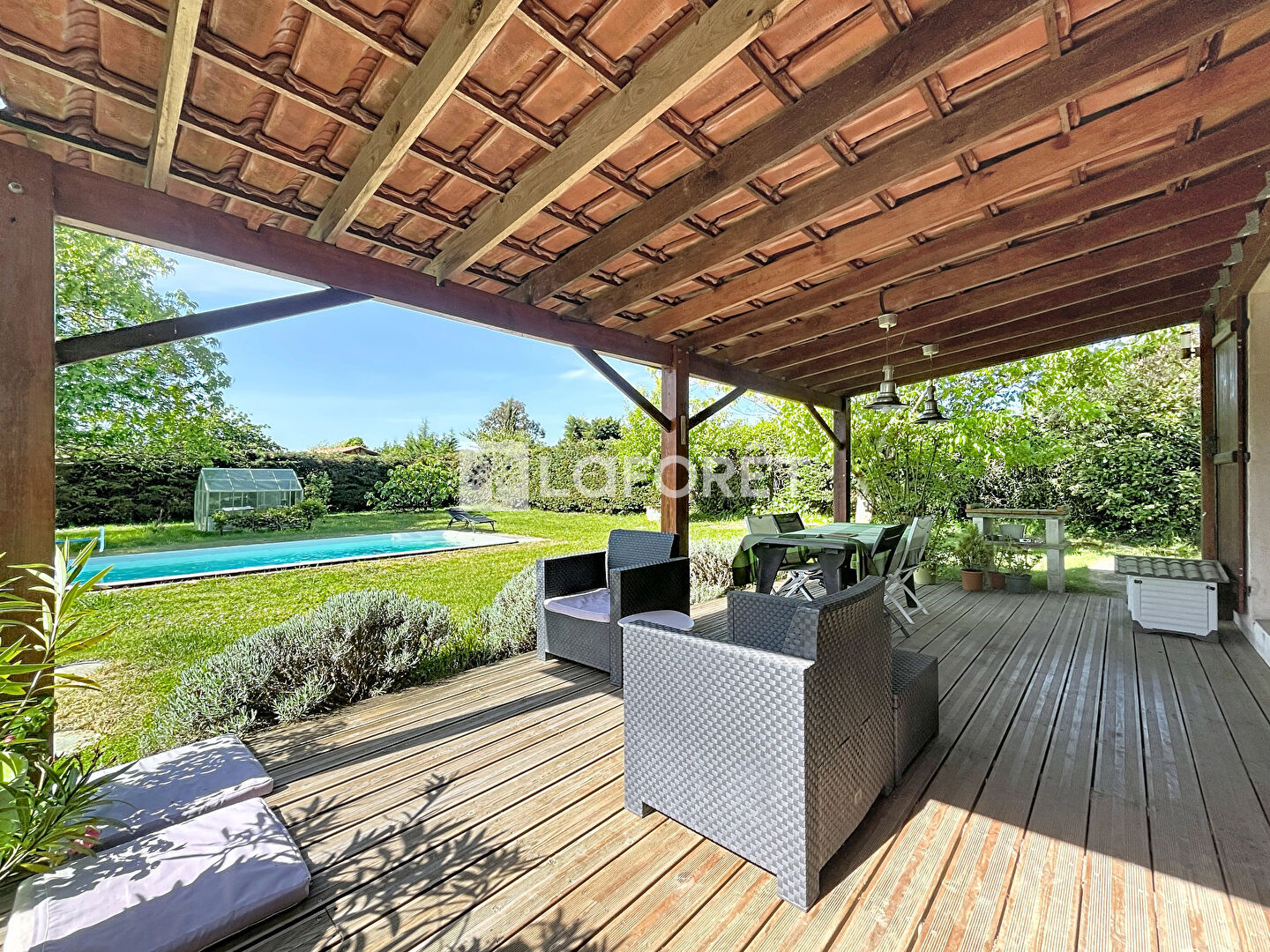Jardin, terrasse couverte. apprenti pour voiture et une dépendance en bois.