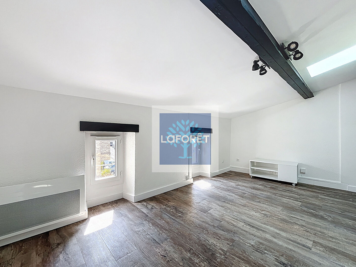 Une pièce de vie lumineuse avec de nombreux rangement.