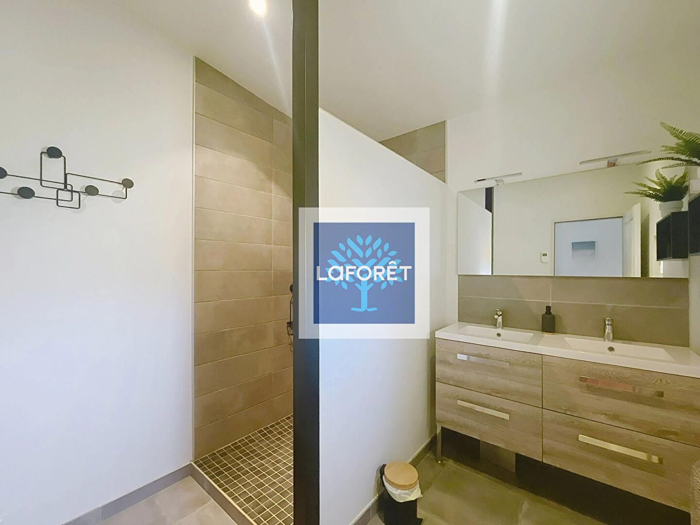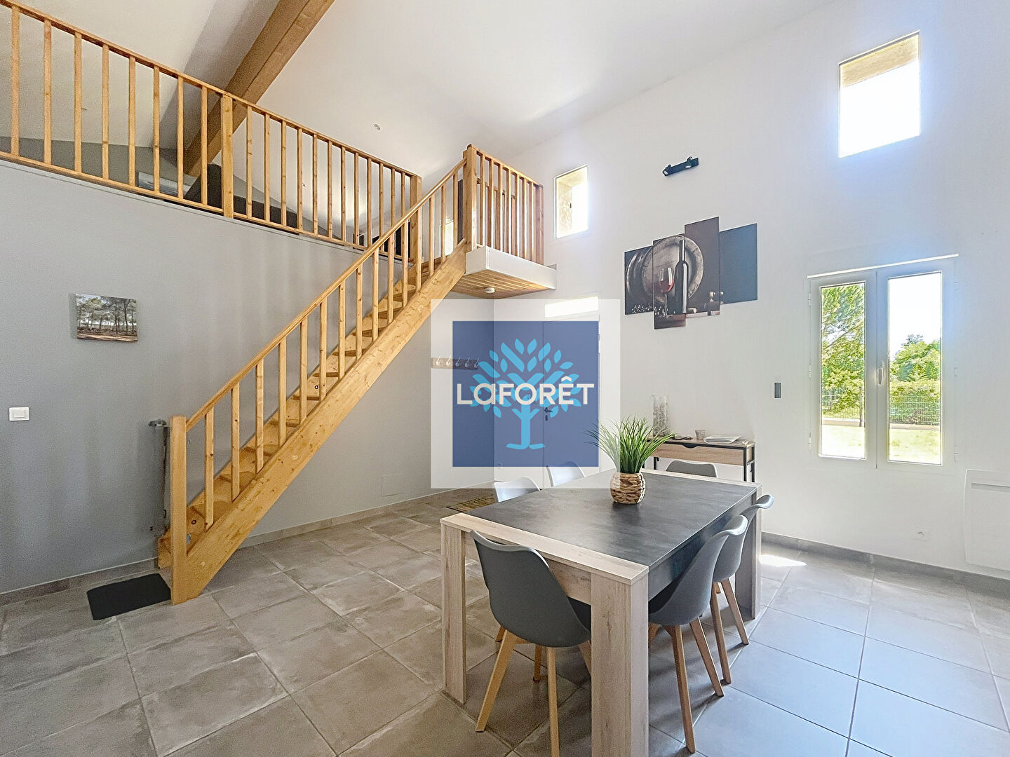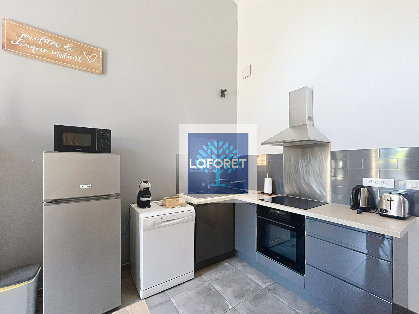 Maison qui se compose d'une salle à manger lumineuse, une cuisine aménagée et équipée avec un coin salle à manger, une mezzanine faisant office de salon, deux chambres dont une avec placard, une salle d'eau, une buanderie et d'un WC.