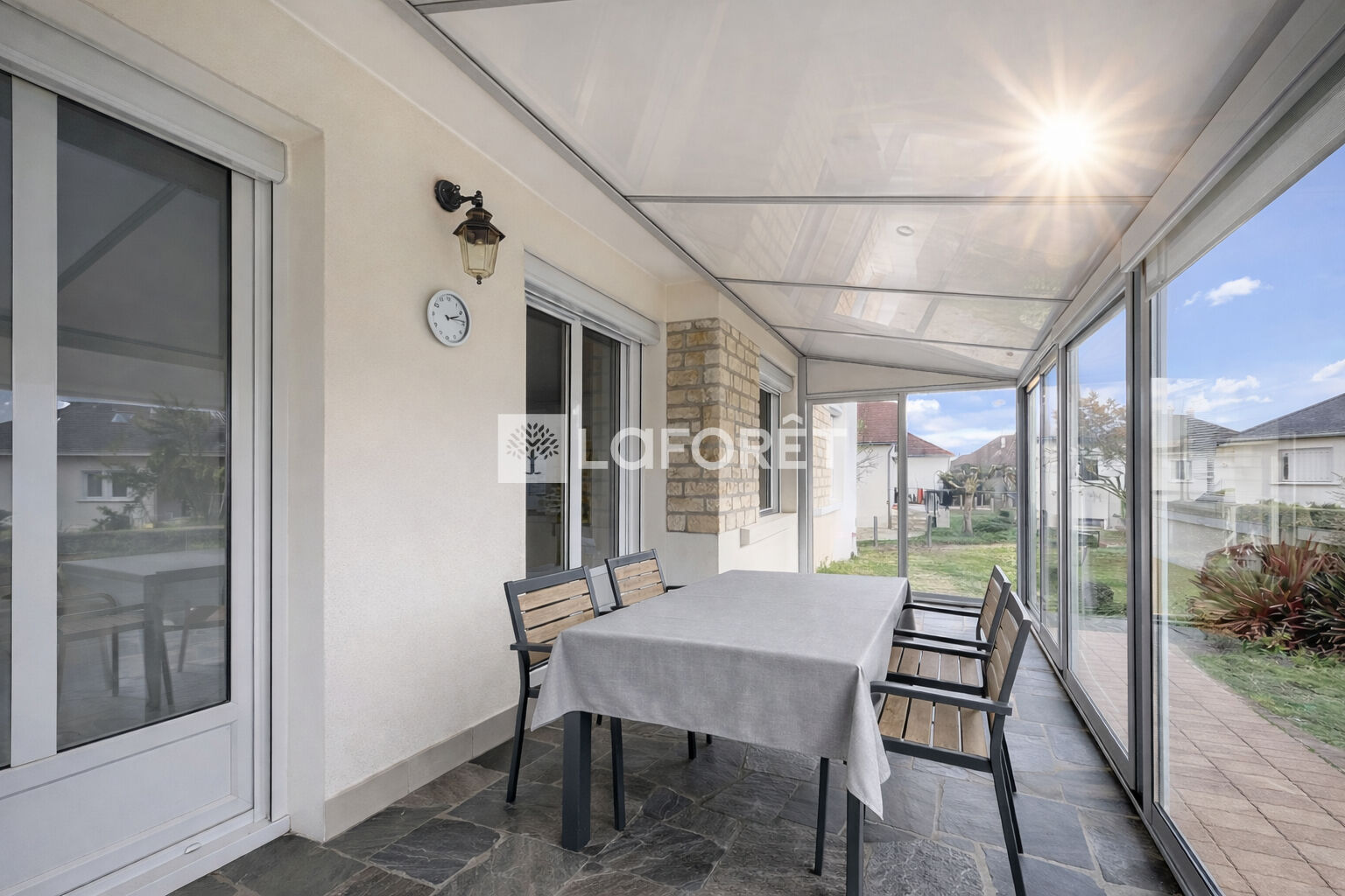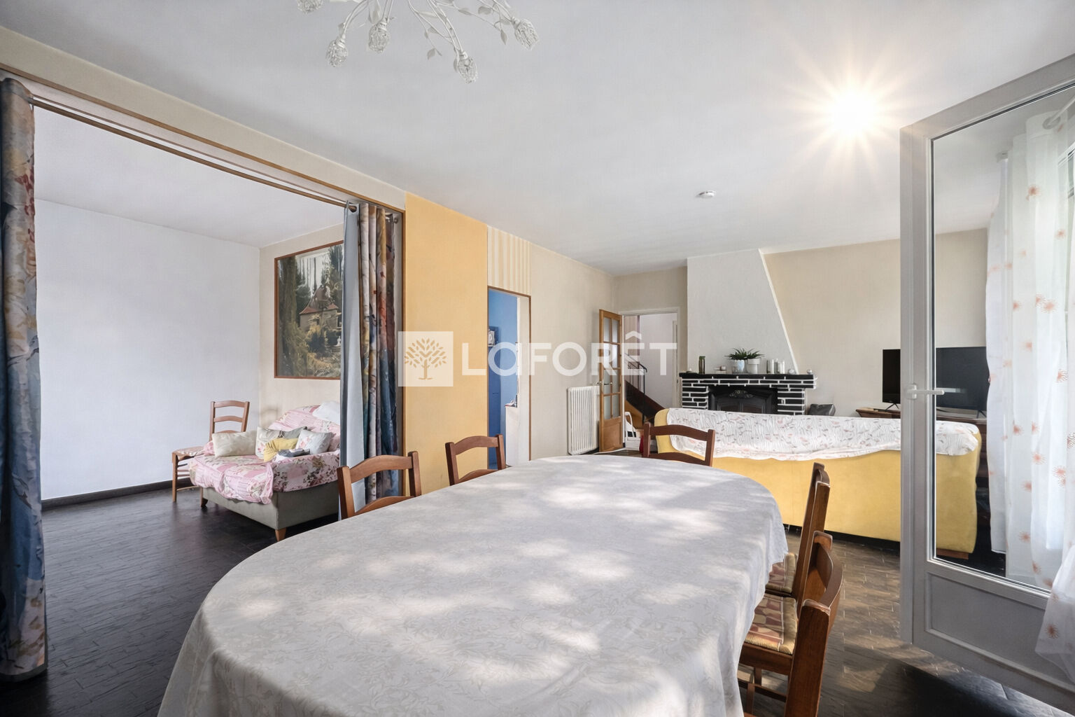 Salon-séjour de 37 m² avec cheminée/poêle à bois, prolongé par une véranda lumineuse de 18 m²
