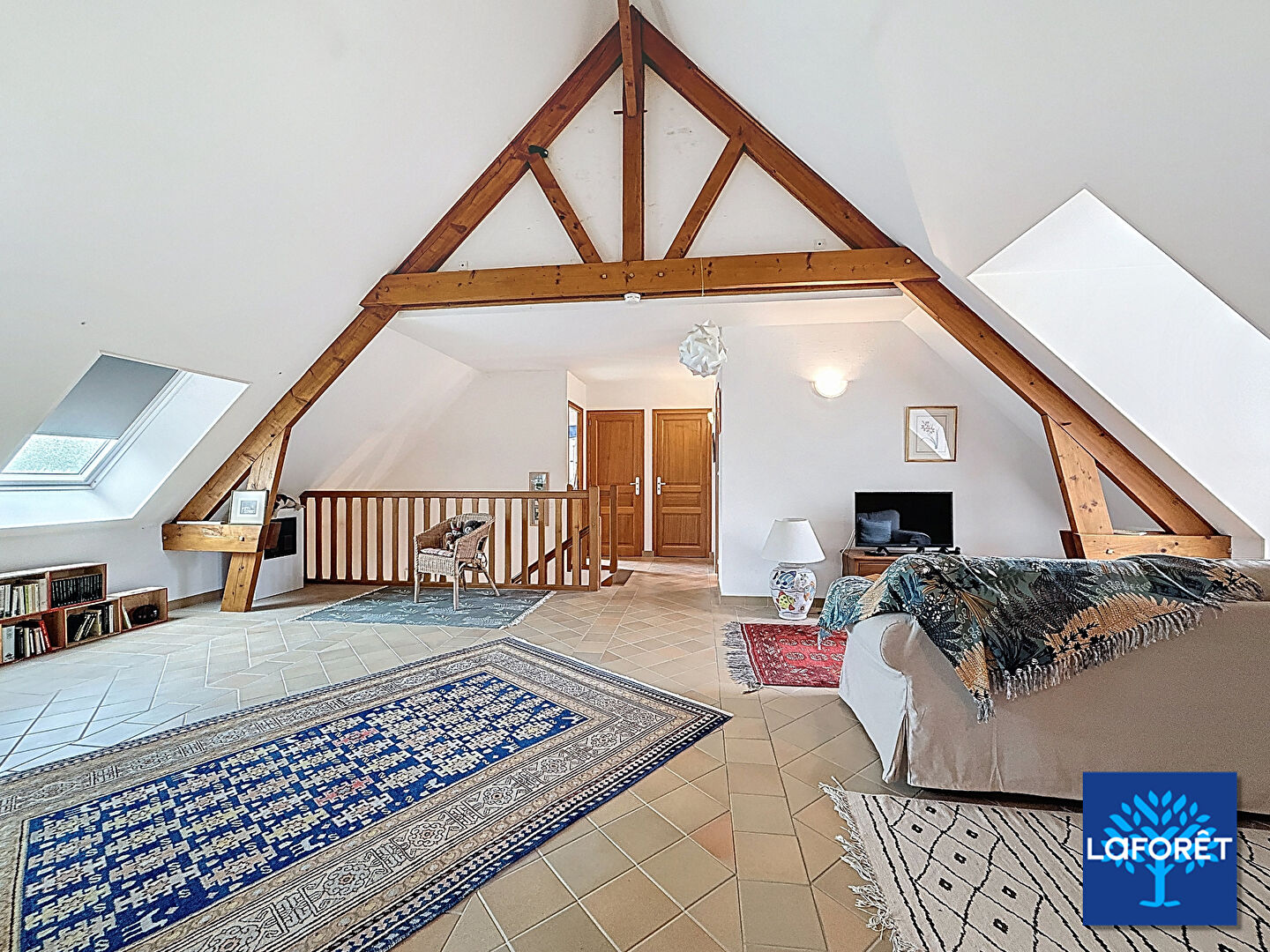 À l'étage, la mezzanine de plus de 30 m² apporte un volume supplémentaire particulièrement apprécié : espace télétravail, salle de jeux ou second salon. Trois chambres ainsi qu'une salle d'eau complètent ce niveau.