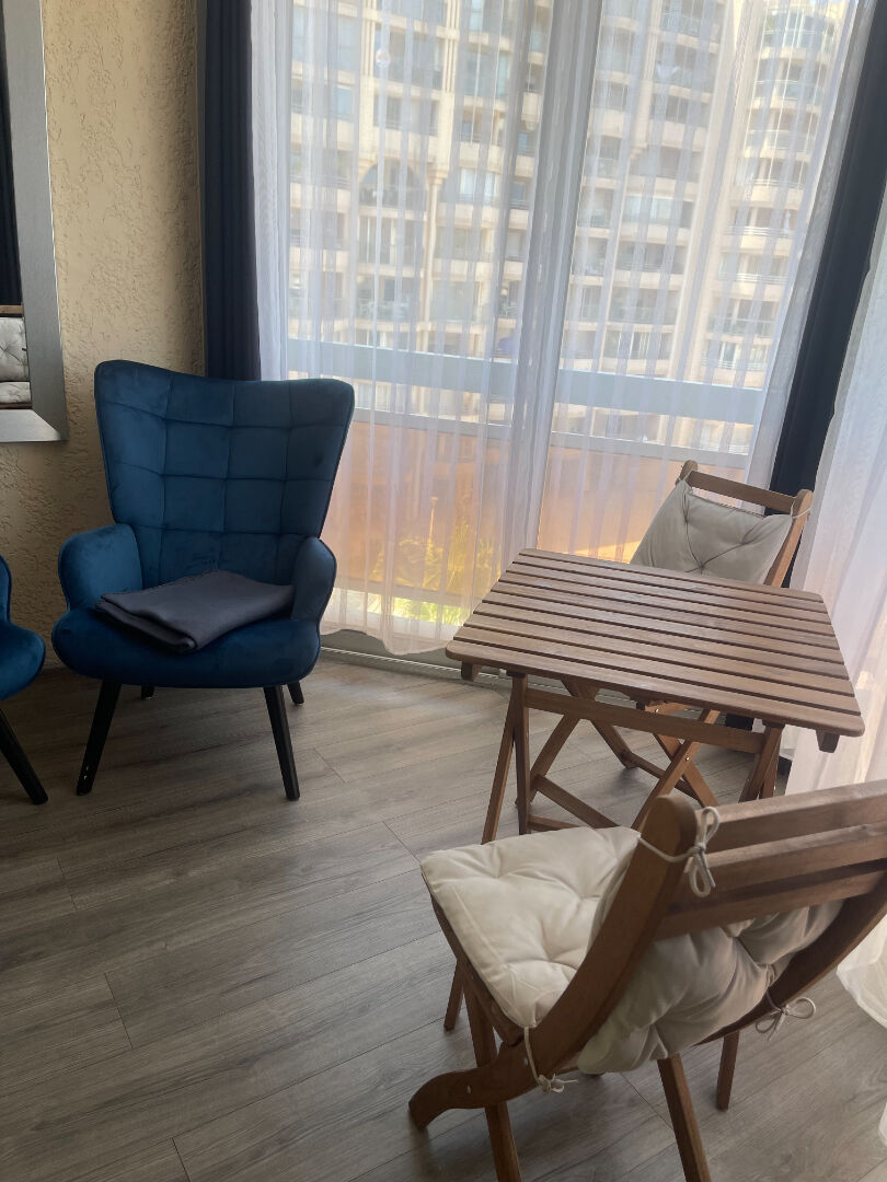 Il se compose d'une pièce à vivre avec une cuisine équipée, d'une salle d'eau et d'une loggia aménagée en petit salon .