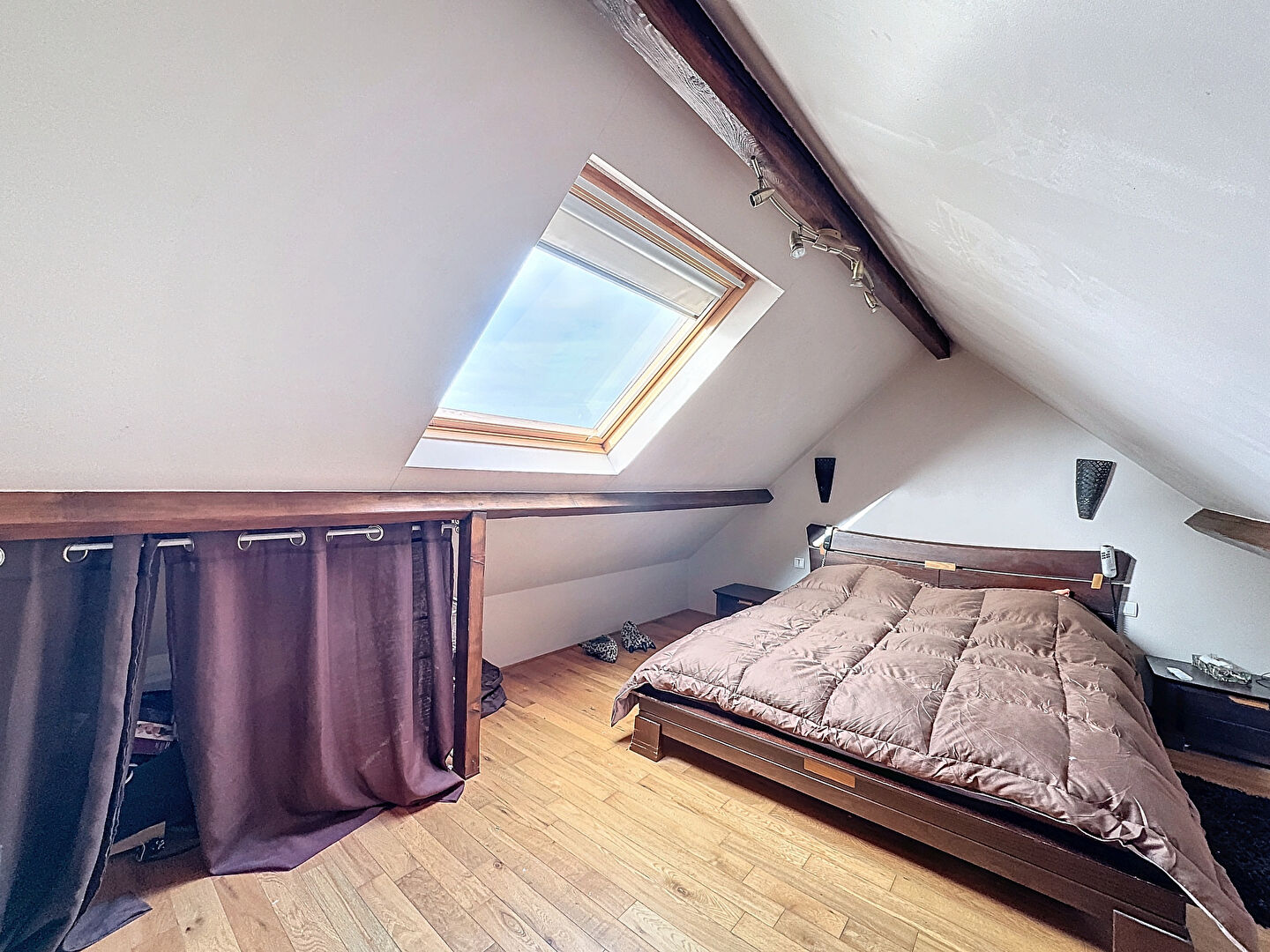 À l'étage, vous trouverez 3 chambres et une salle de bains avec WC. Les combles sont aménagés en suite parentale avec dressing.