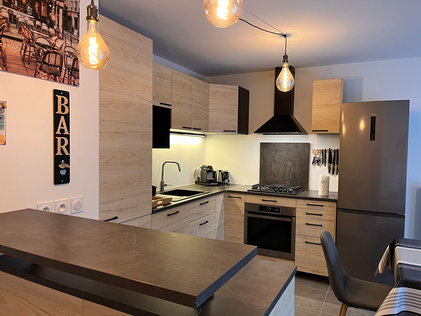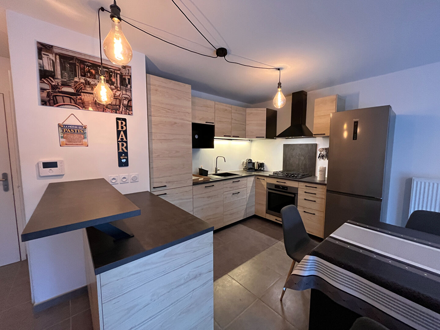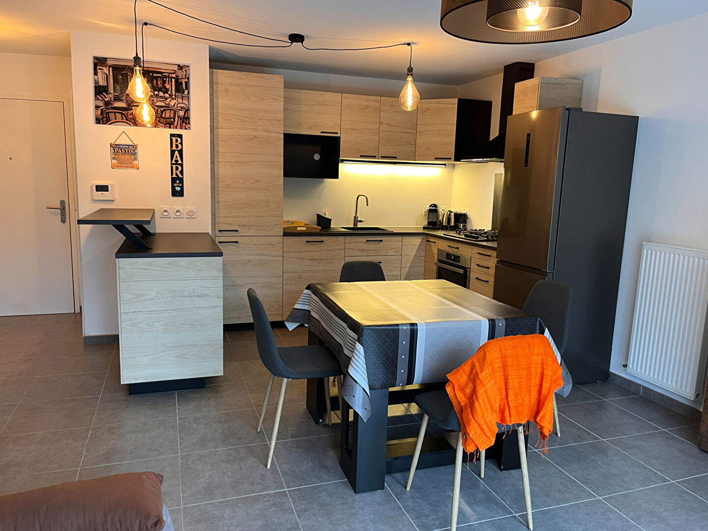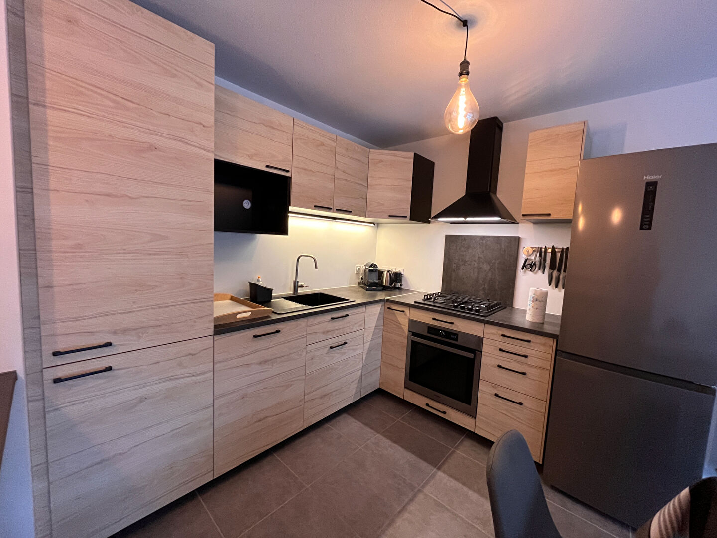 Il se compose d'une agréable pièce de vie, d'une cuisine équipée comprenant une hotte aspirante, une plaque gaz 4 feux, un four, un combiné réfrigérateur-congélateur ainsi qu'une niche dédiée au four micro-ondes.
