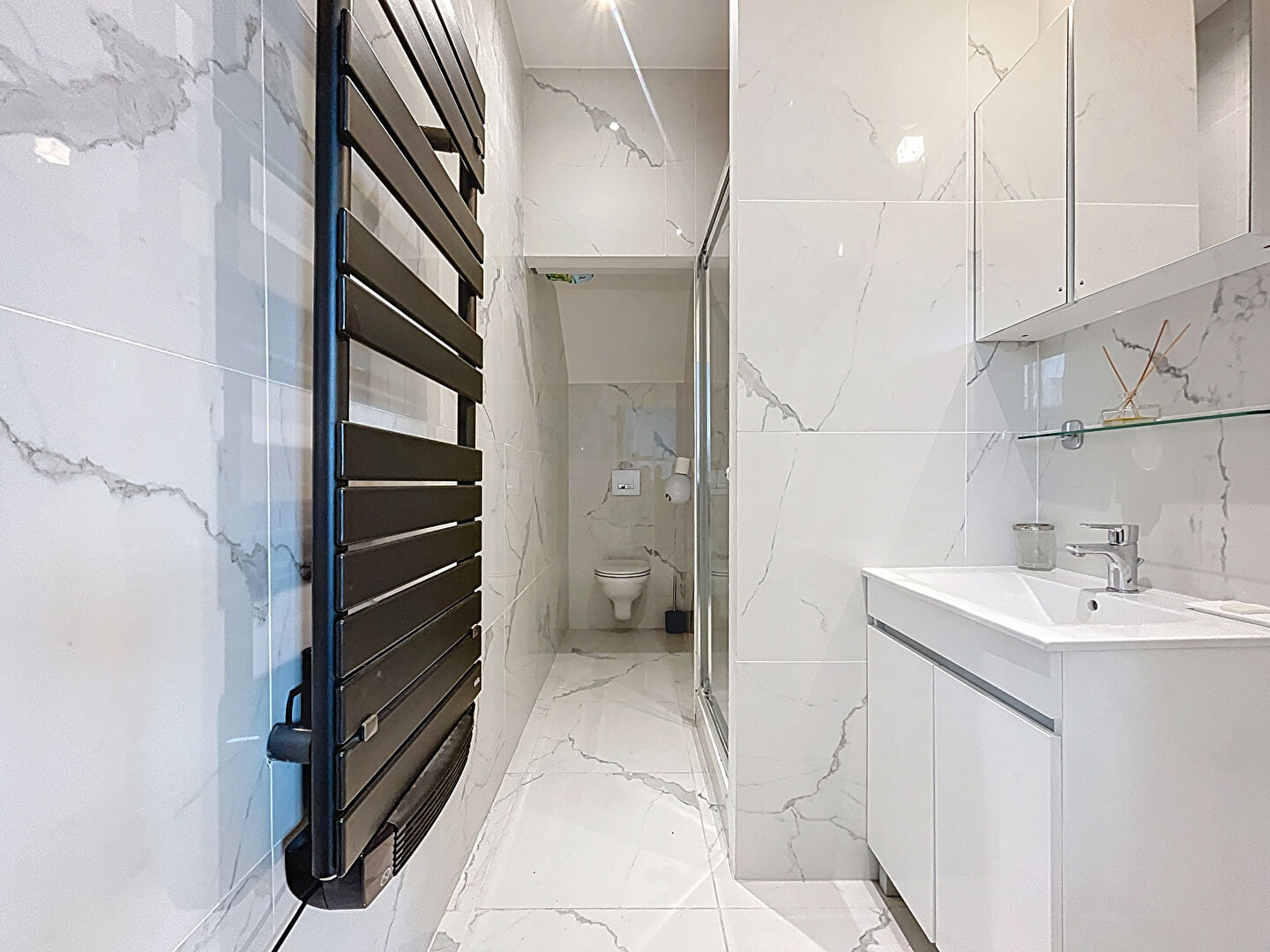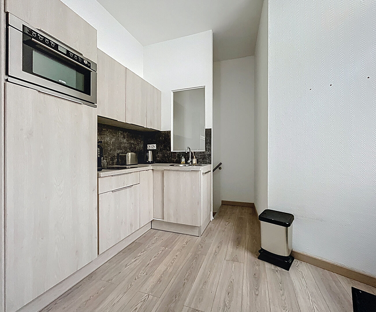 L'appartement se compose d'un bel espace de vie ouvert avec cuisine moderne et équipée, d'une pièce au calme pouvant servir de chambre, de bureau ou d'espace client, ainsi qu'une salle d'eau. L'ensemble a été rénové avec soin, dans un style épuré et élégant, prêt à accueillir vos activités ou vos locataires.