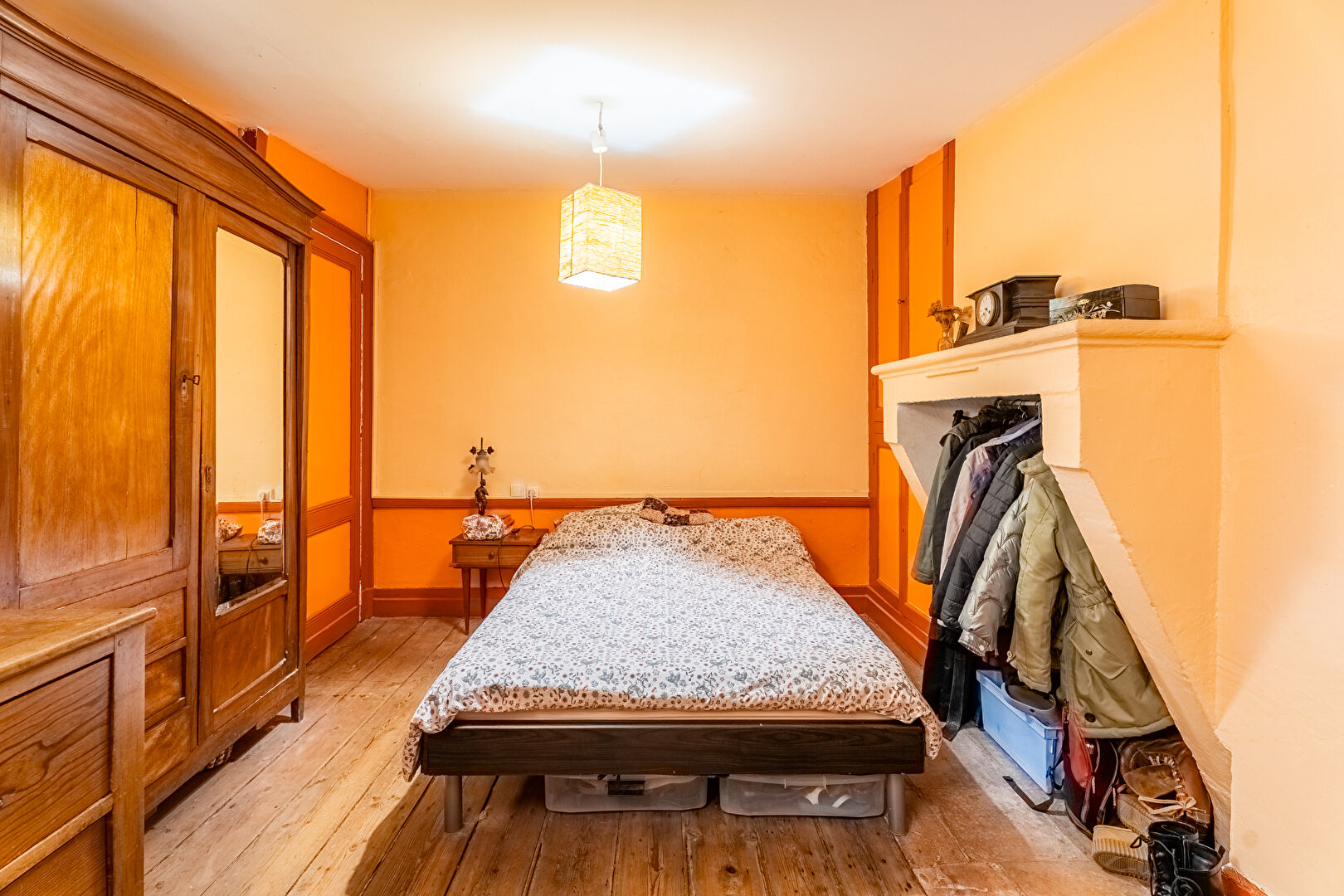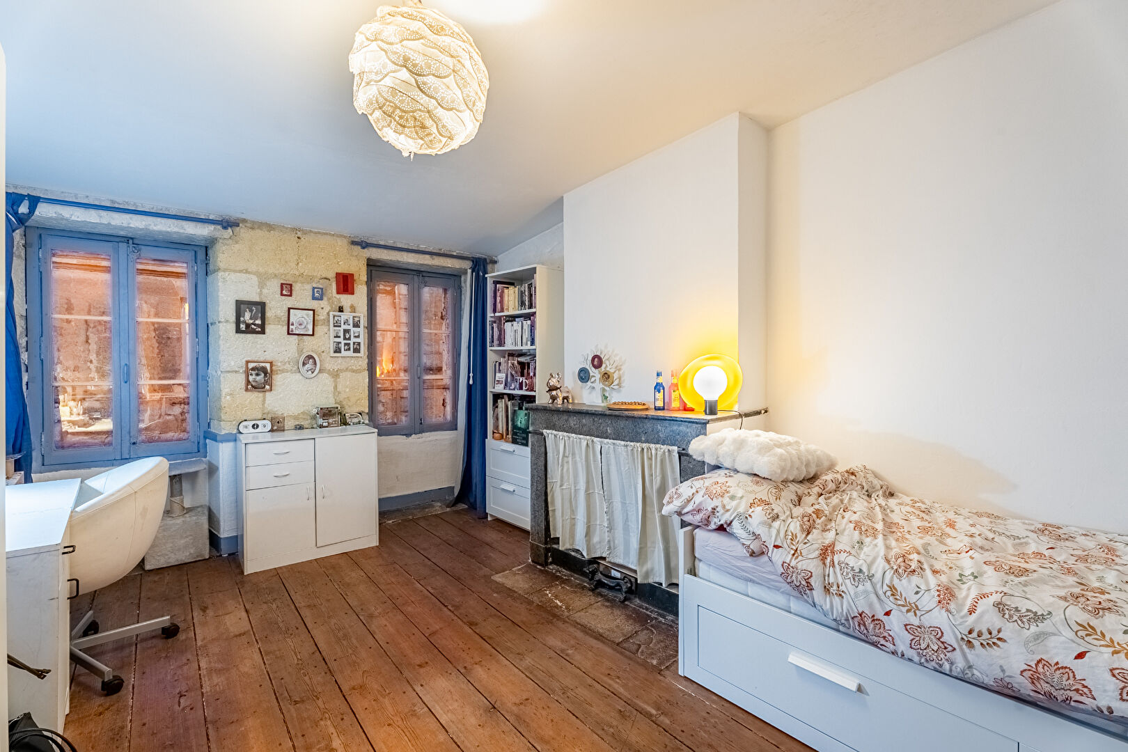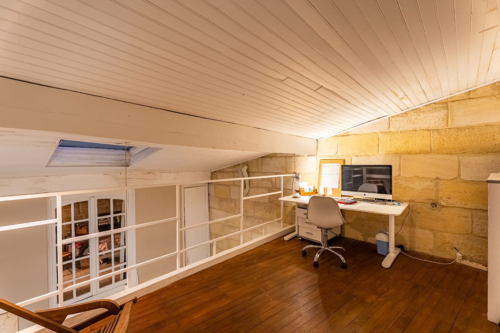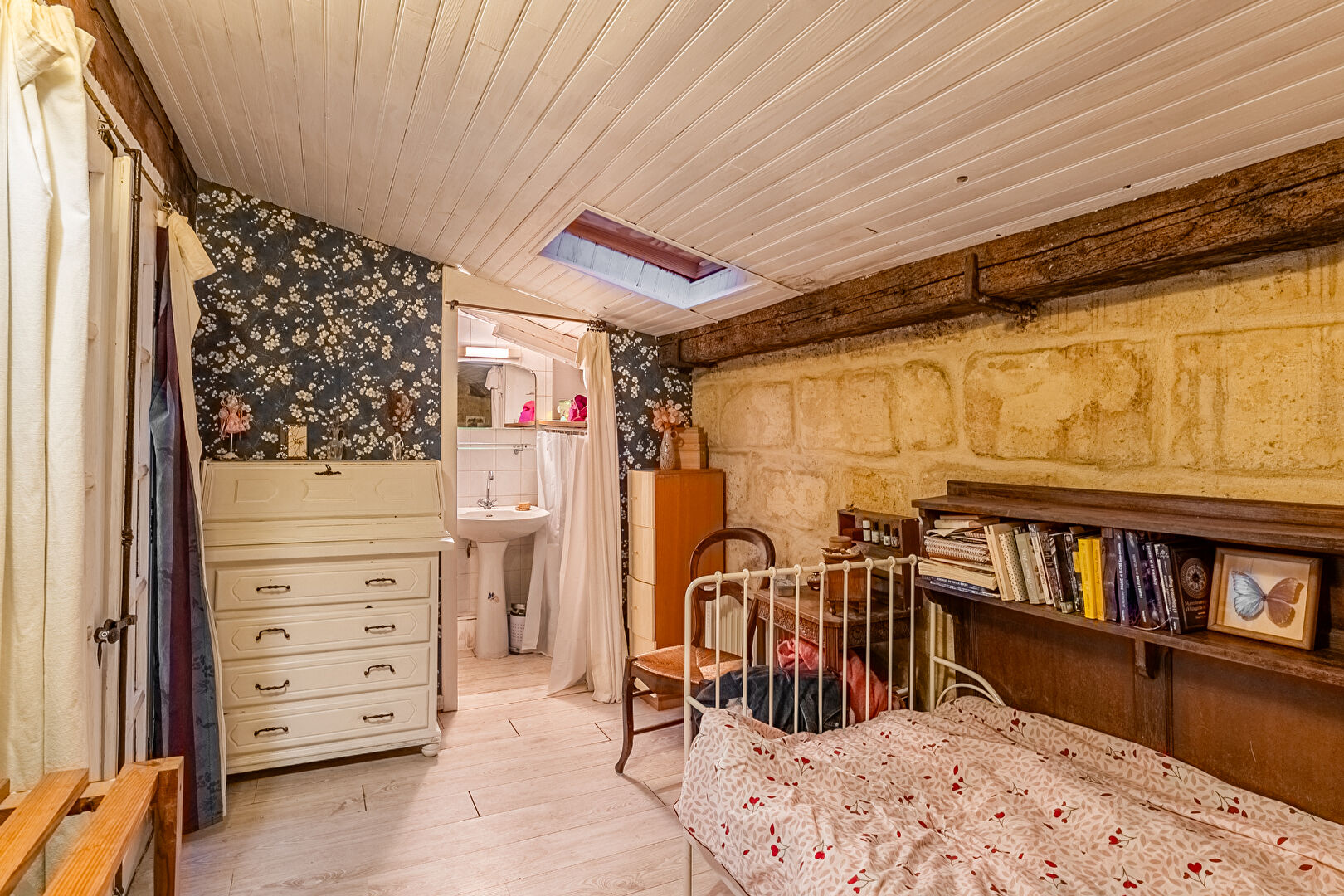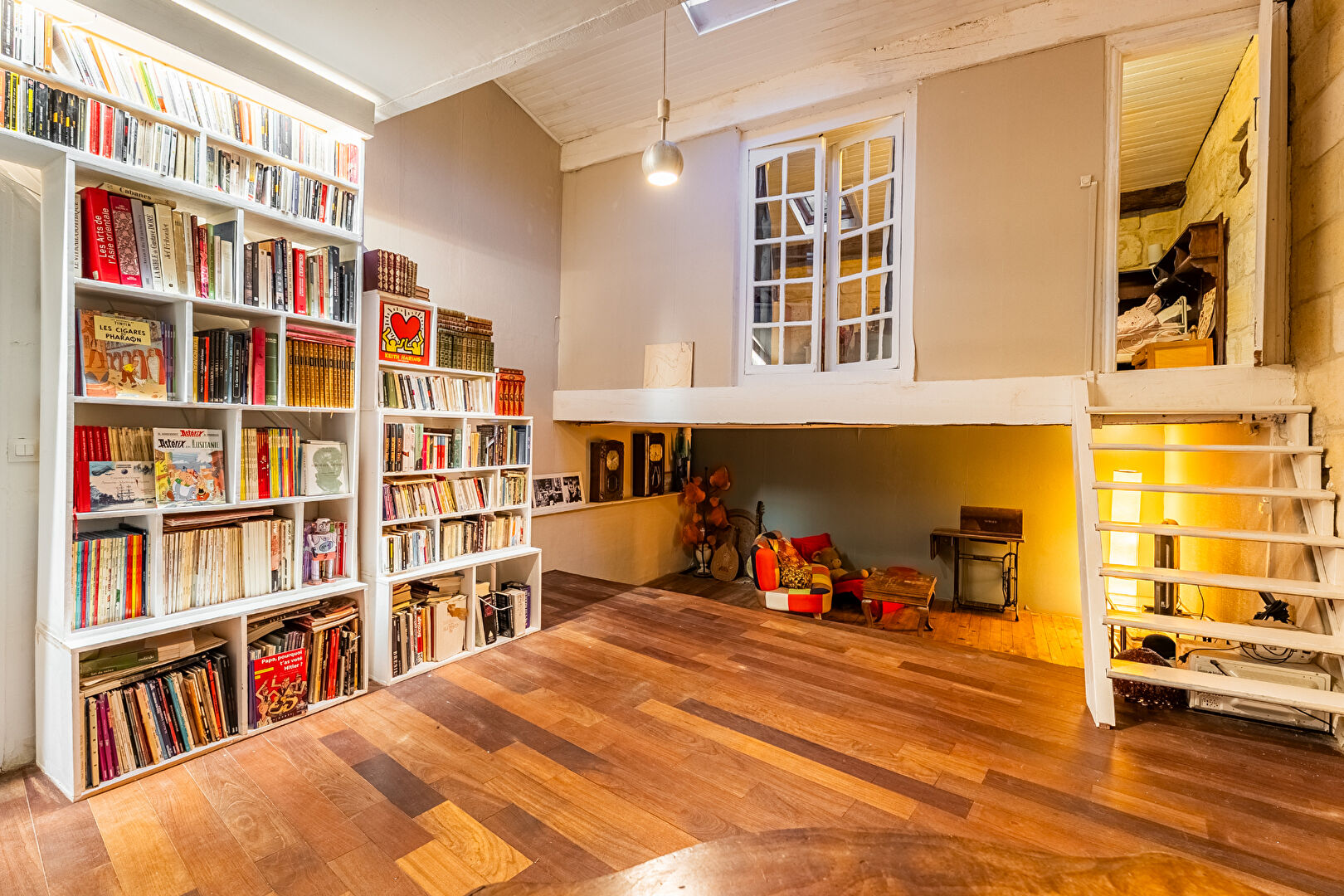 Dans un esprit résolument atypique, jouant avec les volumes et la hauteur sous plafond, une chambre perchée en mezzanine, avec sa salle d'eau, se dévoile comme une petite maisonnette intérieure, pleine de poésie et de charme.