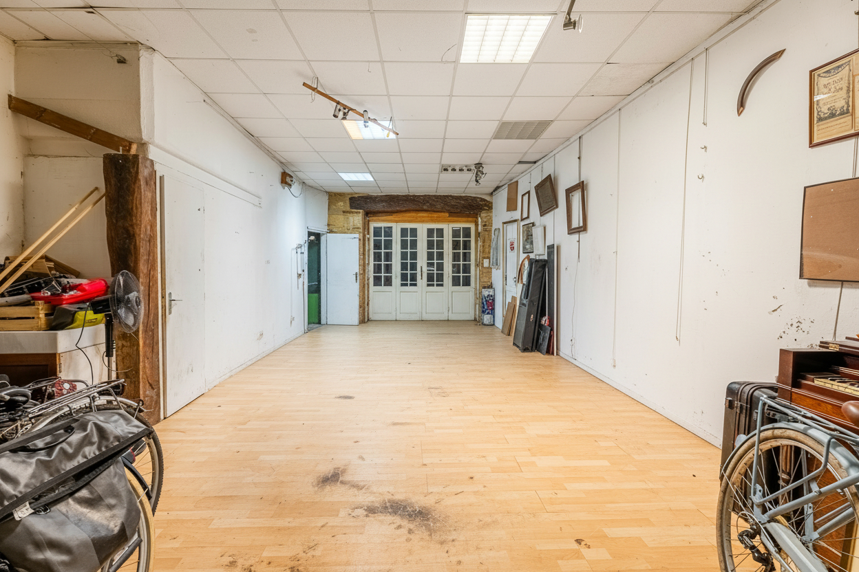 Édifiée sur trois niveaux, la maison s'ouvre au rez-de-chaussée sur un vaste atelier de 72 m² sous forme de Local , aujourd'hui utilisé comme garage grâce à son accès direct sur rue, complété par un espace salle de musique et une remise. Ce niveau dispose également d'un WC et d'un point d'eau, offrant de multiples possibilités d'aménagement (RBNB/ Atelier d'Artiste/ Bureau.)