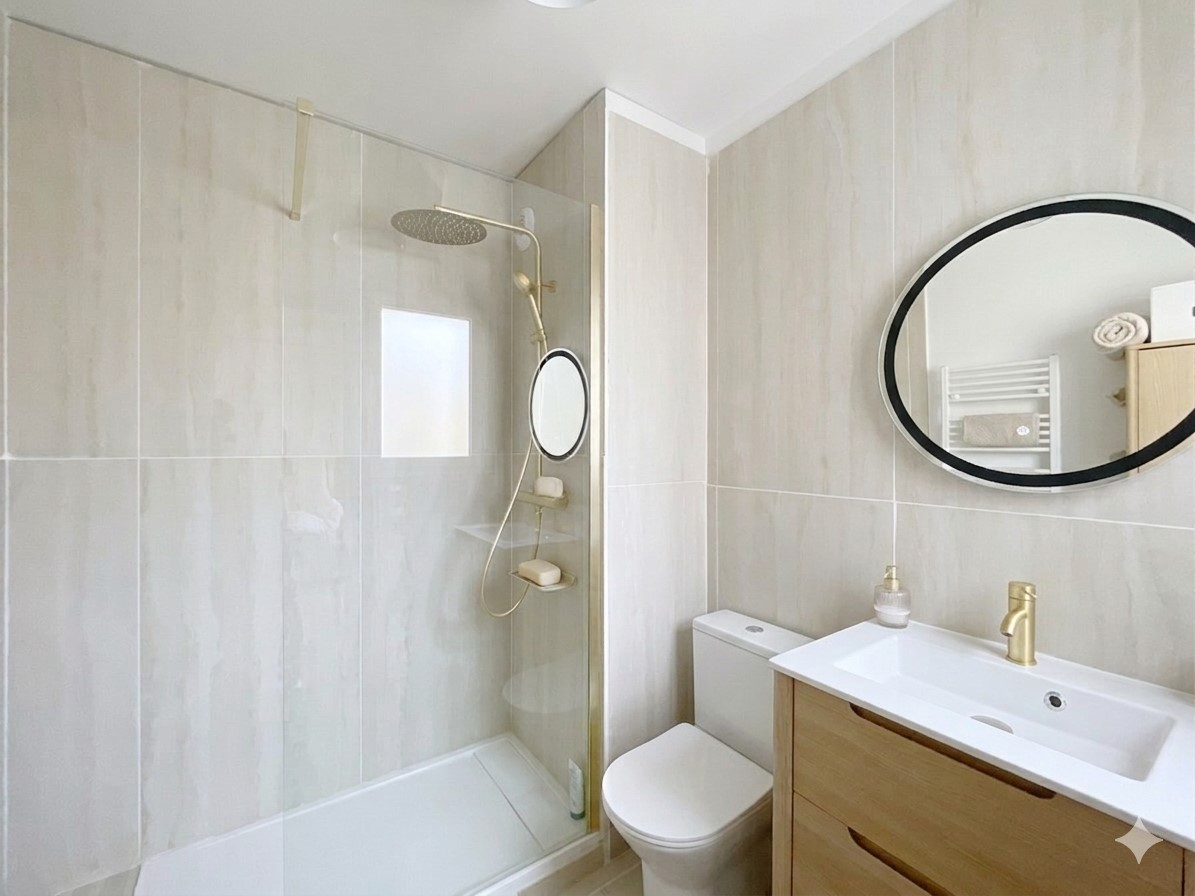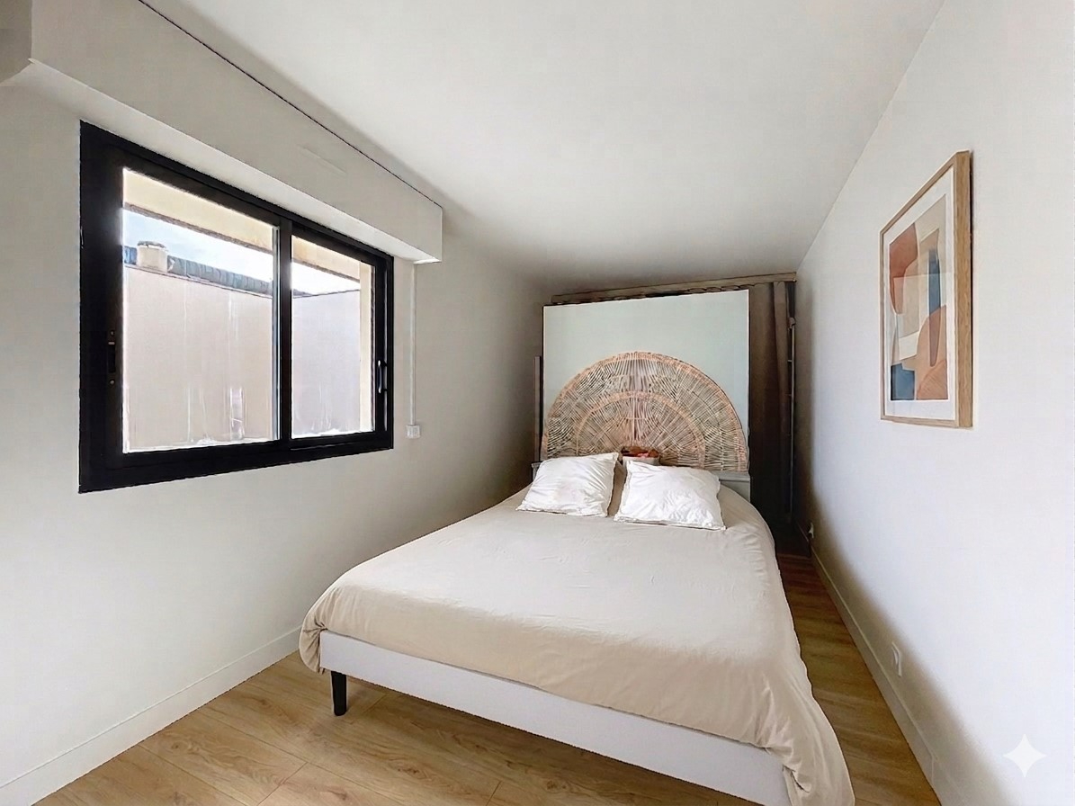 Côté nuit, une chambre confortable dispose d'un dressing intégré sur mesure, complétée par une salle d'eau moderne avec WC.