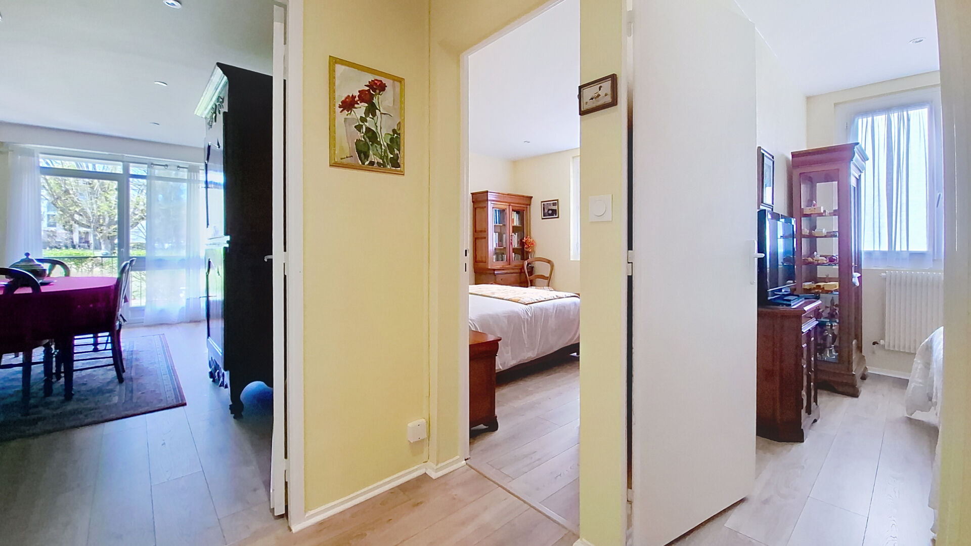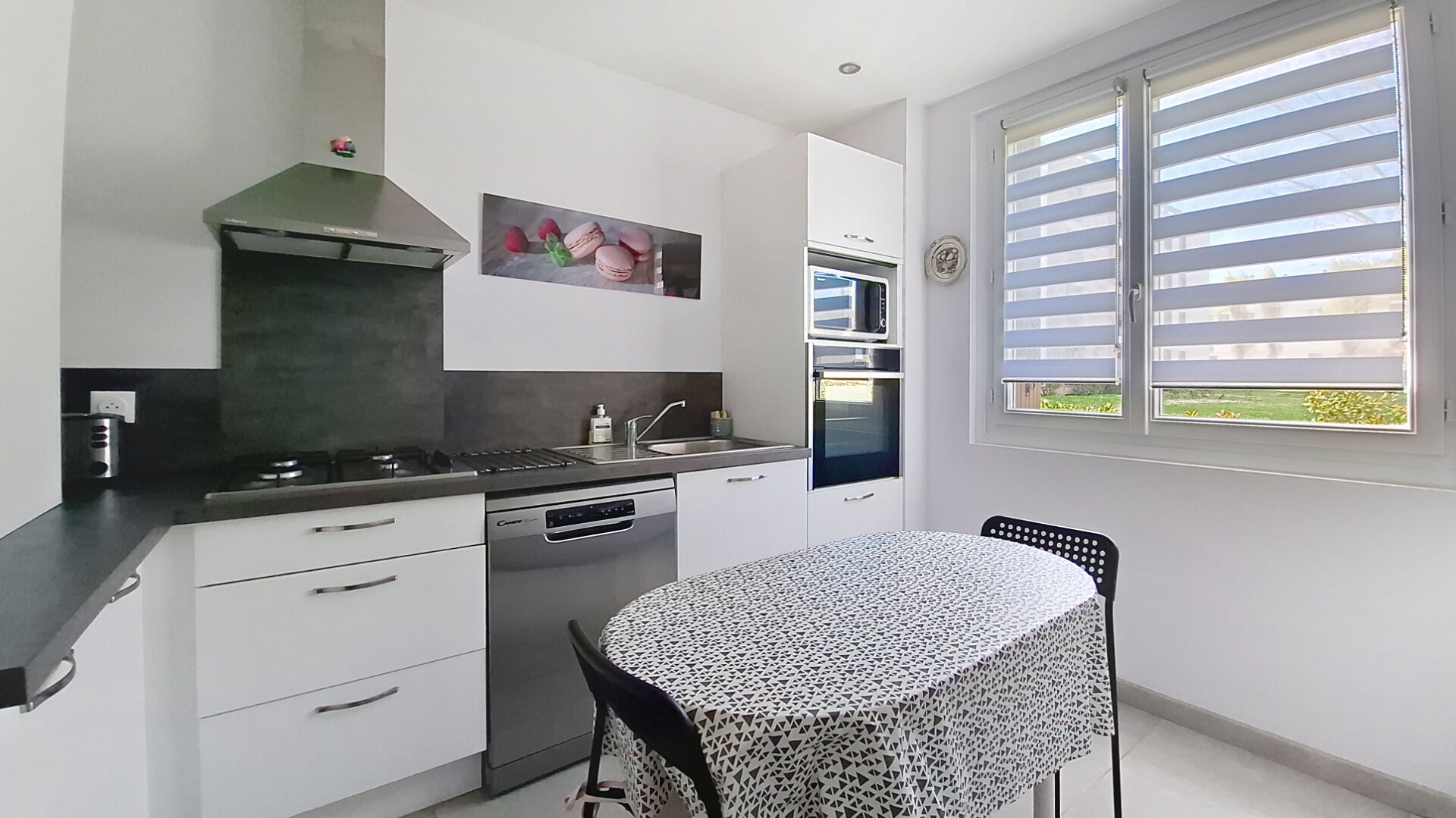 Dès l'entrée, vous découvrirez un intérieur soigné et fonctionnel. La cuisine, entièrement aménagée et équipée, s'accompagne d'une buanderie et d'un cellier, offrant des espaces de rangement appréciables au quotidien. Le double séjour, baigné de lumière grâce à son exposition ouest, s'ouvre sur une vue dégagée sur le parc de la résidence, créant une atmosphère à la fois paisible et verdoyante.