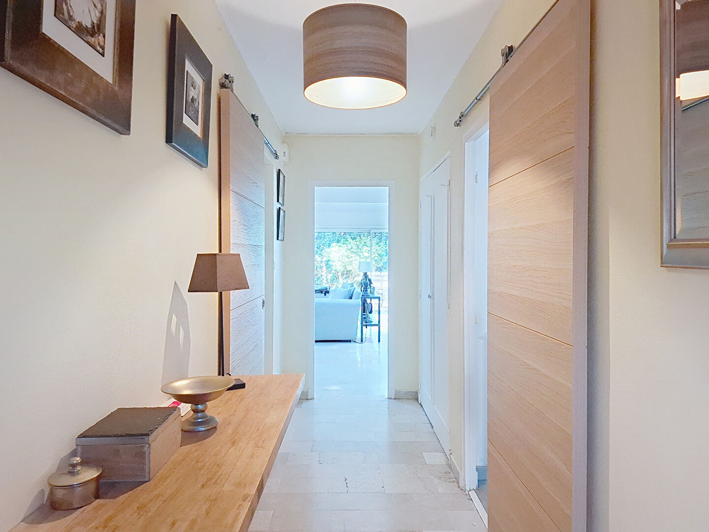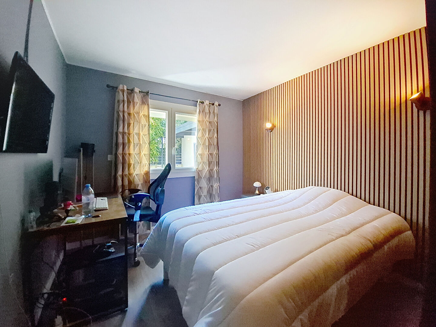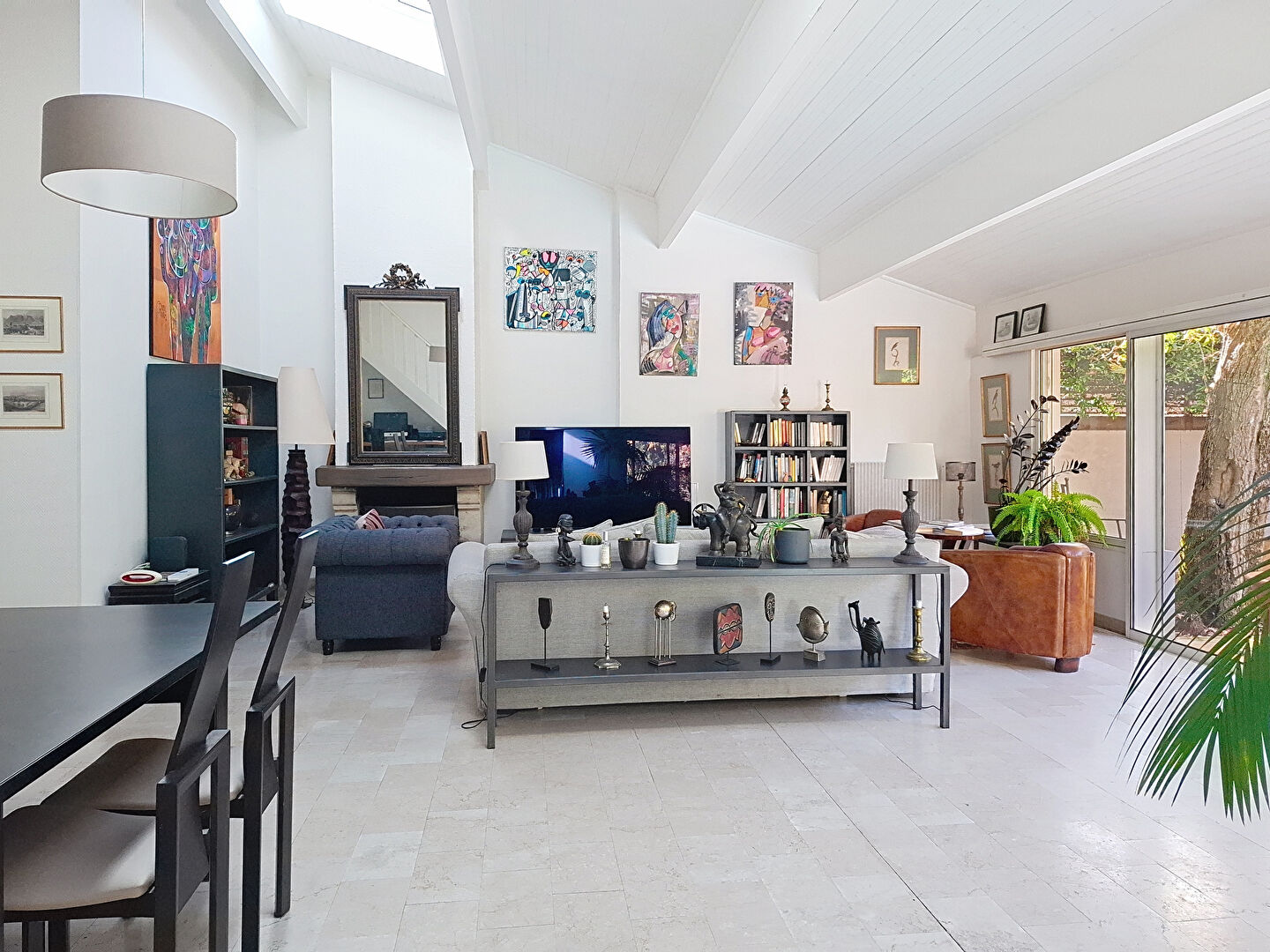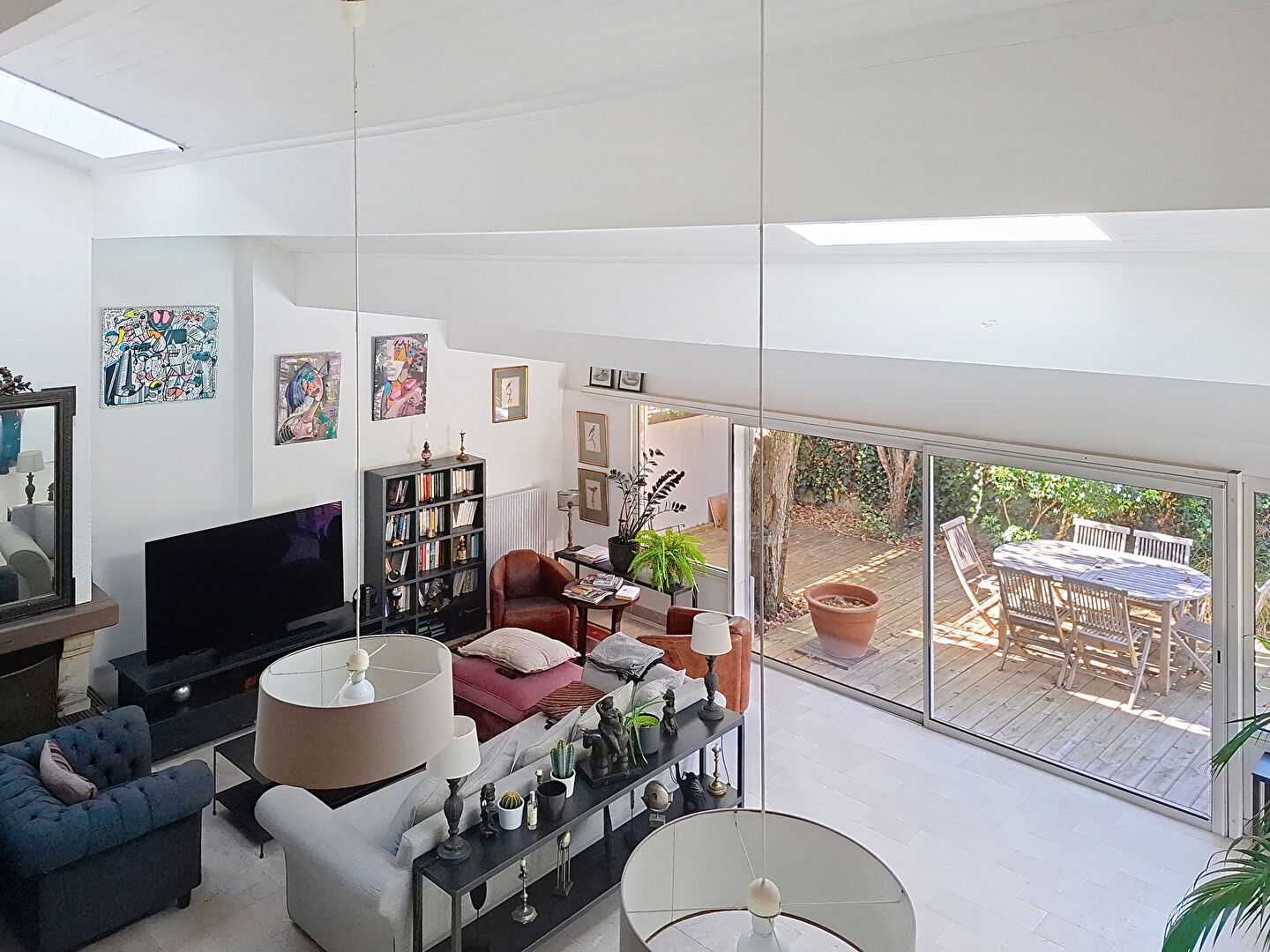 Dès l'entrée, on découvre un vaste séjour de 55 m², baigné de lumière grâce à de larges baies vitrées orientées ouest, qui s'ouvrent sur les espaces extérieurs. Le volume est sublimé par un plafond cathédrale, une cheminée chaleureuse et une climatisation pour un confort optimal en toute saison. Ce séjour devient le coeur de la maison, un lieu de vie où il fait bon se retrouver.