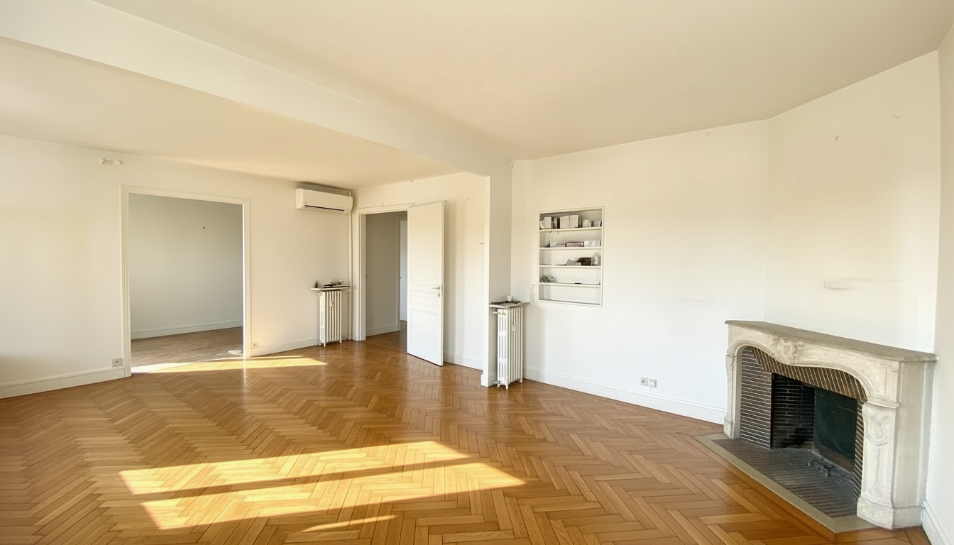 Belle copropriété ancienne avec gardien, bien entretenue, appartement de 100m° avec le charme de l'ancien (parquet, cheminée moulures), : comprenant une entrée, un double séjour, 2 chambres, une cuisine séparée, une grande salle de bains et douche, et un WC séparé.