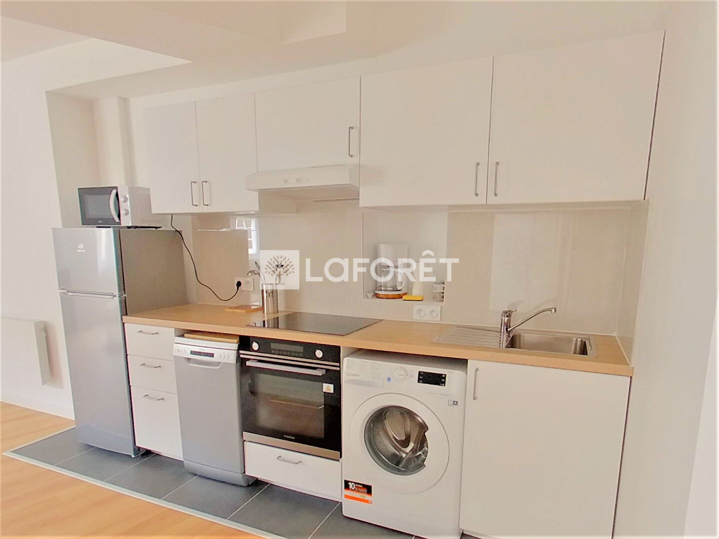 entièrement meublé, offrant 2 chambres avec placards, cuisine ouverte aménagée et équipée (réfrigérateur/congélateur, four, plaque de cuisson, hotte, lave-vaisselle, lave-linge, micro-onde et vaisselle), séjour, salle d'eau avec douche et WC,