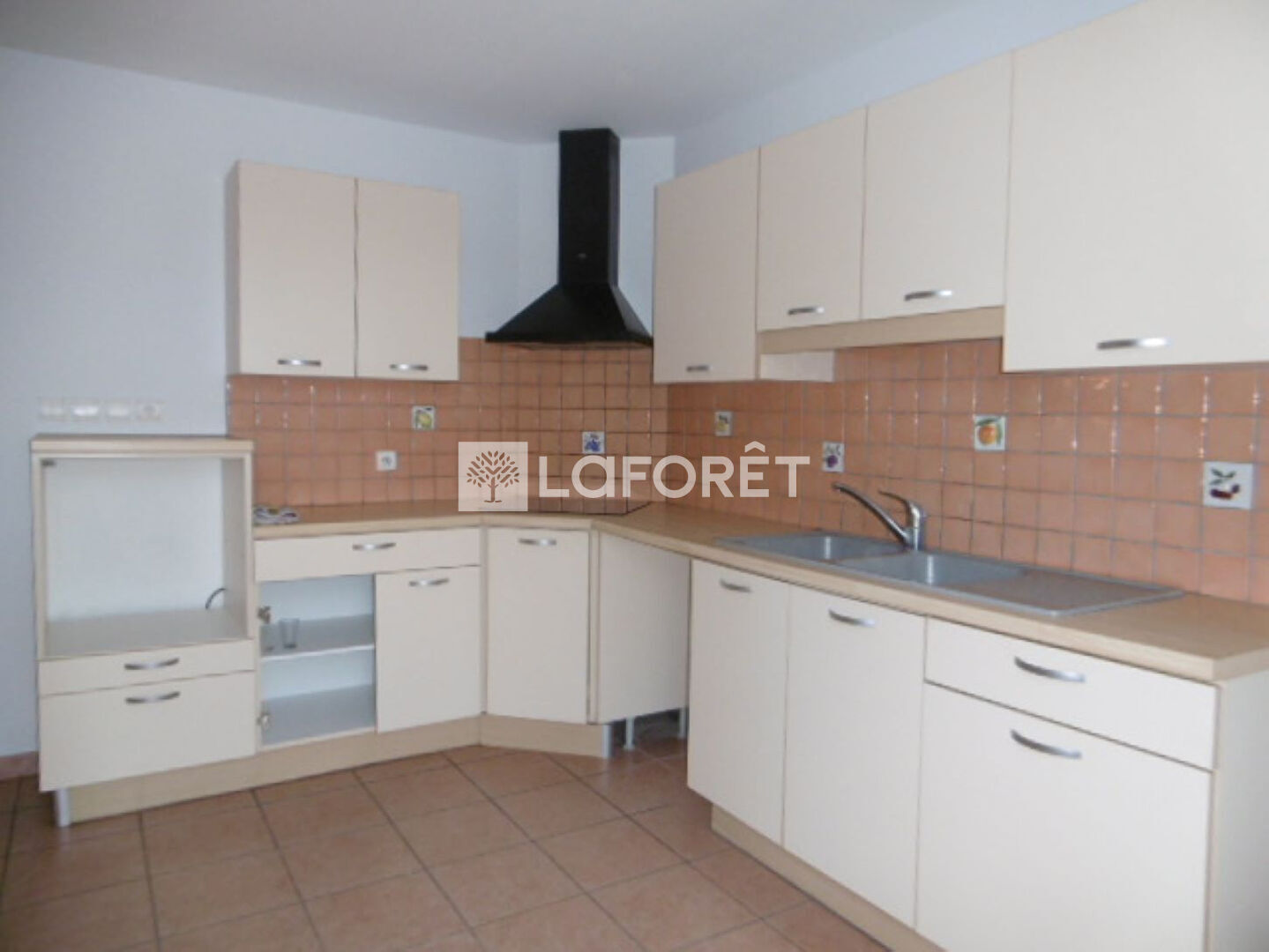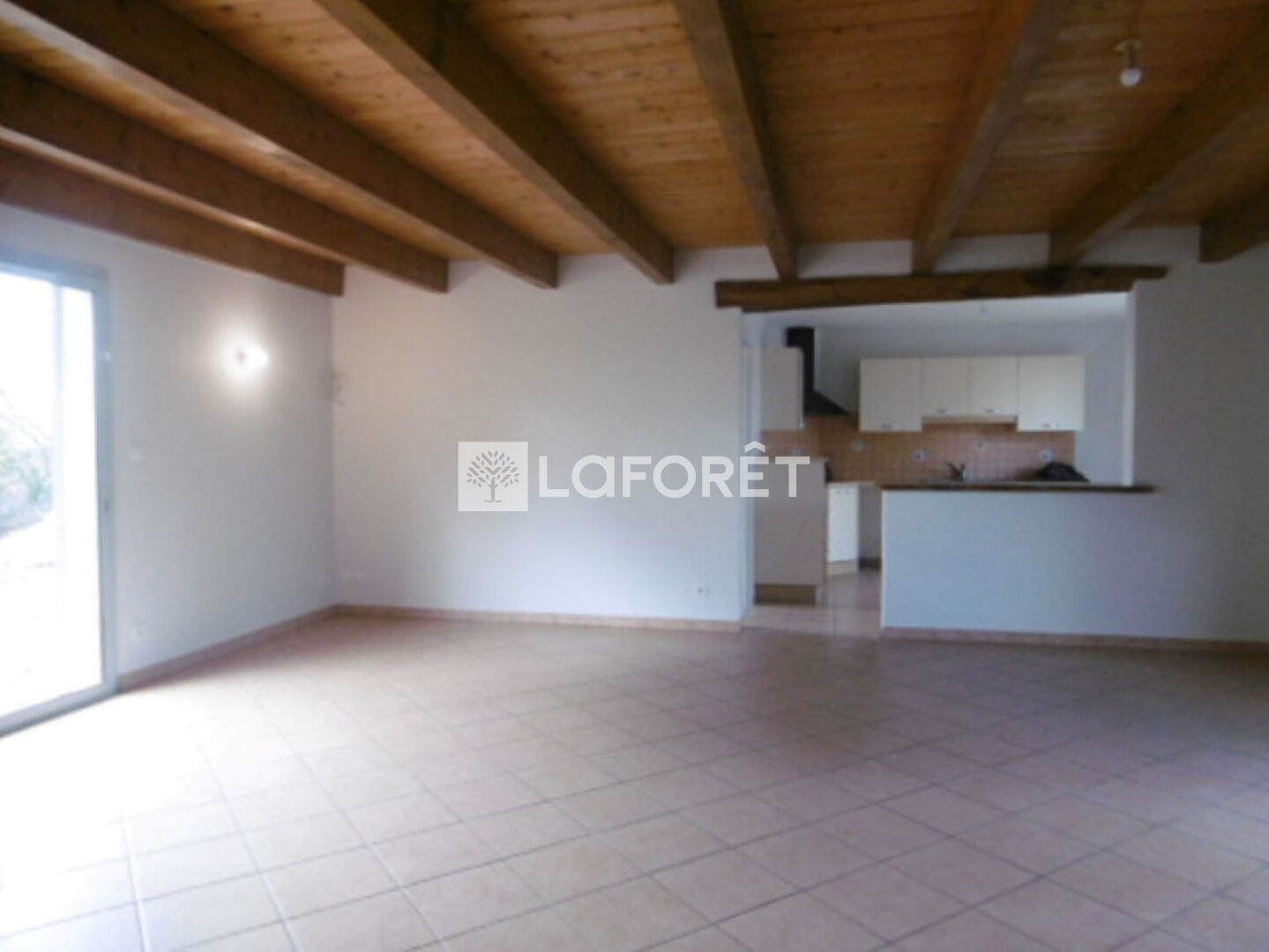 Une cuisine semi-équipée (plaques de cuisson et hotte d'aspiration) ouverte sur séjour avec cheminée, buanderie, couloir, 3 chambres, salle de bains et WC.
