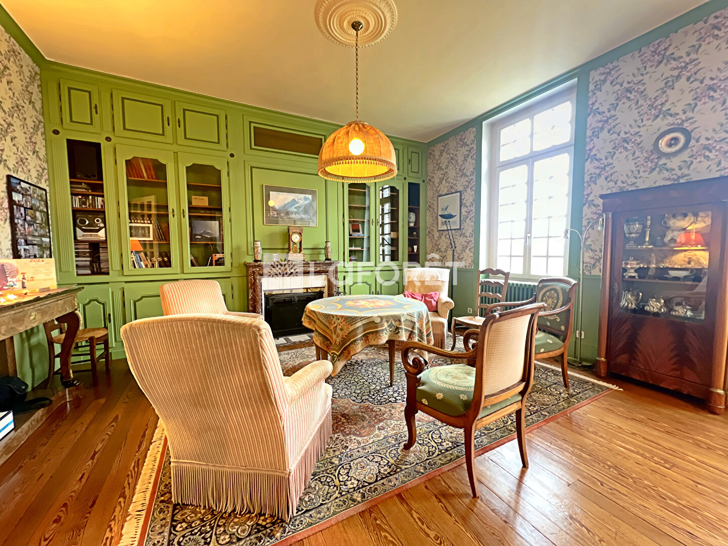 Au rez-de-chaussée, découvrez une cuisine équipée, une spacieuse pièce de vie, et un salon-bibliothèque, tous ornés de parquet ou tomettes, cheminées et moulures d'antan.