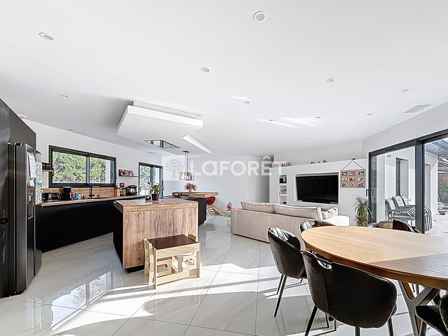 Dès l'entrée, un hall avec placard dessert une vaste pièce de vie de 60 m², lumineuse et conviviale, intégrant une cuisine aménagée et équipée IXINA. L'espace est complété par un cellier attenant, une buanderie fonctionnelle avec un accès direct à un garage de 30 m² équipé d'une porte sectionnelle motorisée, ainsi qu'en extérieur un portail motorisé ALU équipé d'un visiophone connecté.