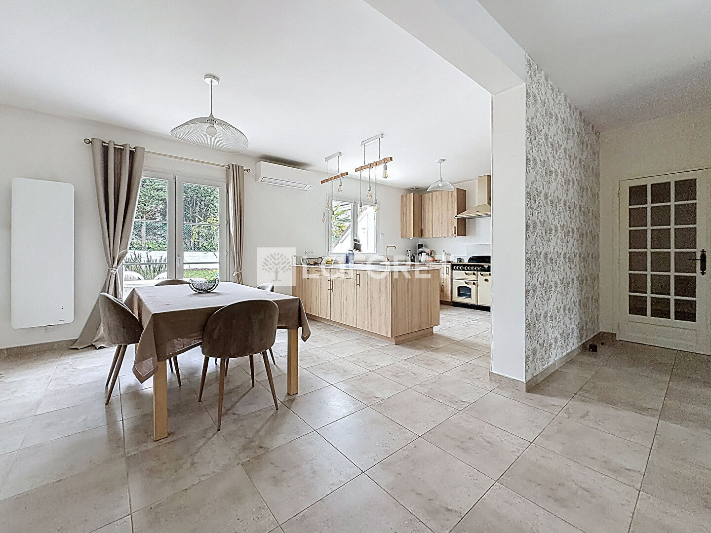 Le rez-de-chaussée accueille un superbe espace de réception baigné de lumière, composé d'un séjour et d'une salle à manger ouverts sur une cuisine contemporaine parfaitement intégrée. L'ensemble s'ouvre de plain-pied sur le jardin et la terrasse, créant une véritable continuité entre intérieur et extérieur.