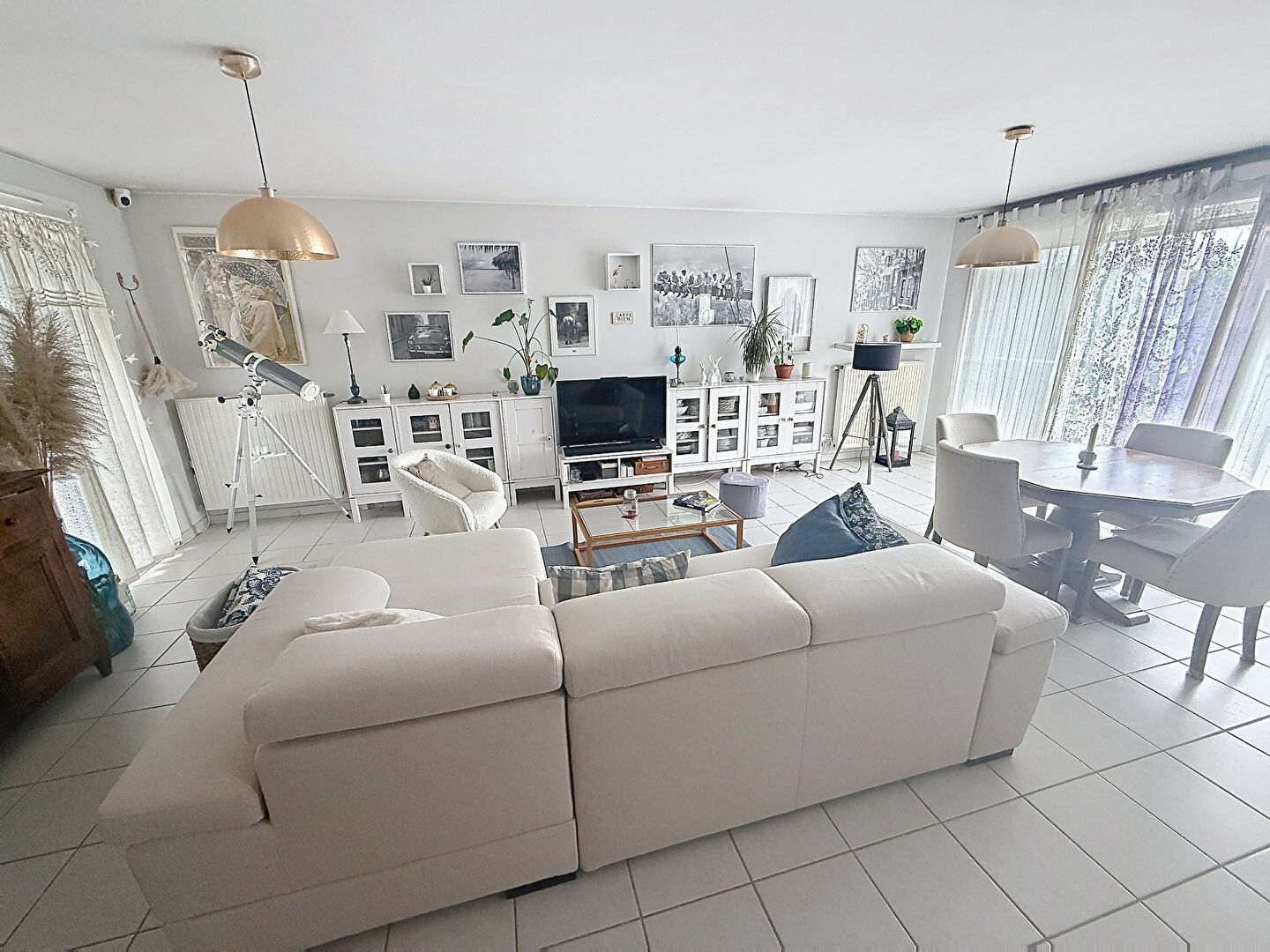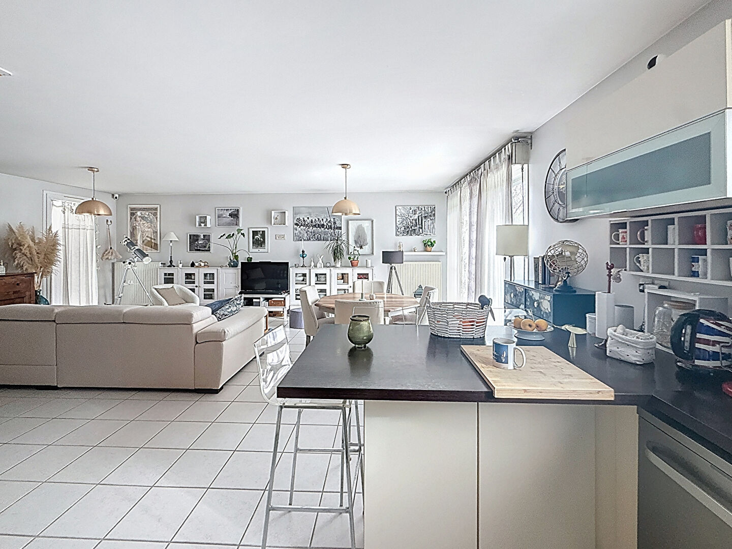 La maison comprend au rez-de-chaussée un salon lumineux avec cuisine américaine équipée. À l'étage se trouvent trois chambres, deux salles de bains ainsi qu'une loggia. Le bien dispose également d'un garage et est implanté sur un terrain de 351 m², offrant un cadre de vie agréable.