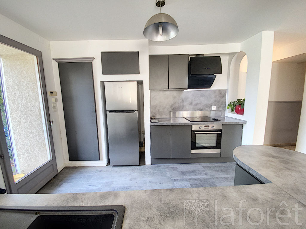 Au rez-de-chaussée, l'entrée dessert une agréable pièce de vie lumineuse avec cuisine équipée entièrement neuve, un salon chaleureux ainsi qu'une salle d'eau moderne.