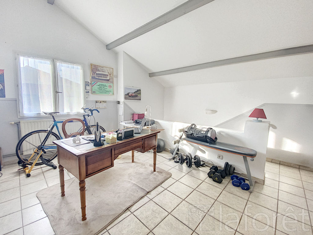 Le premier étage propose un espace bureau idéal pour le télétravail, deux chambres de belle surface et une vaste salle de bains comprenant à la fois une douche et une baignoire.