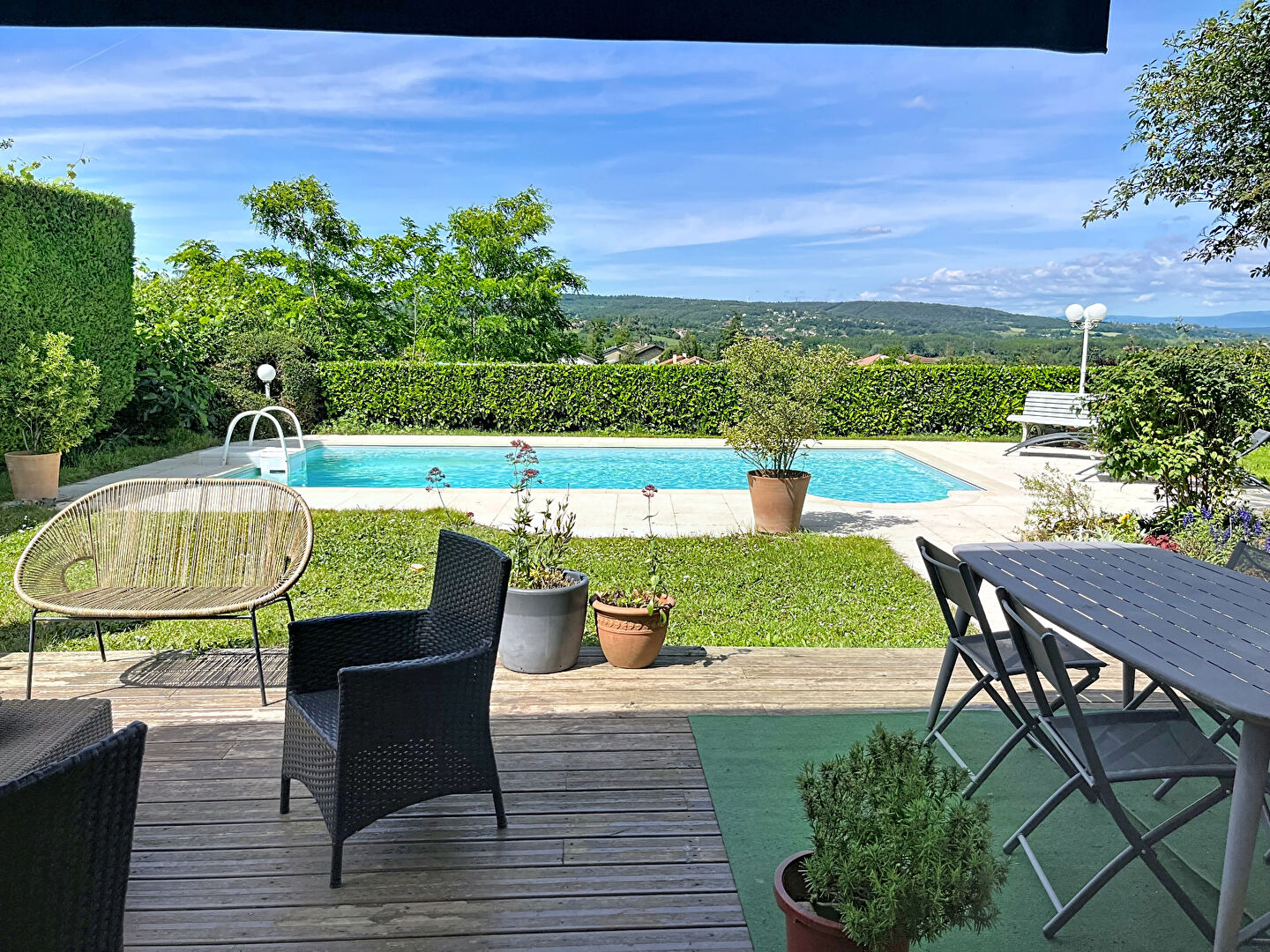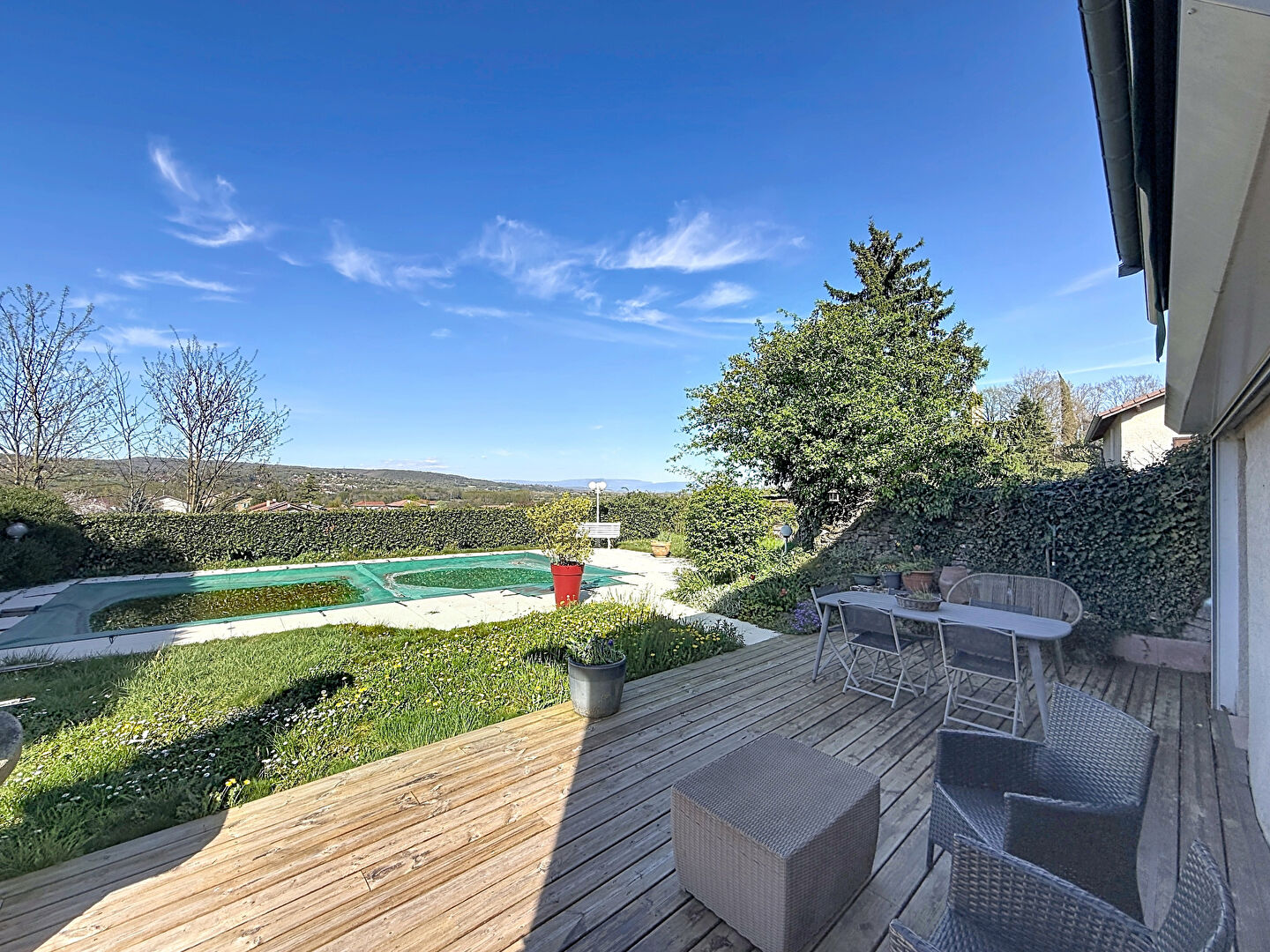 Implantée sur un terrain de 580 m², la propriété bénéficie d'une vue dégagée et dominante offrant un cadre de vie privilégié.