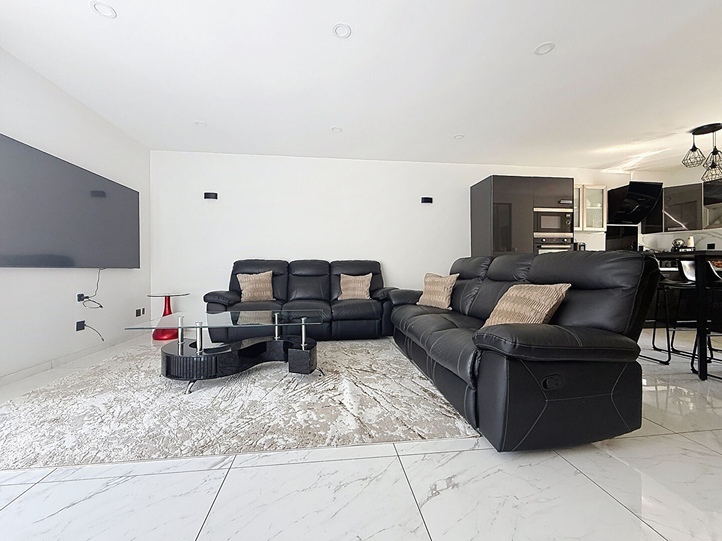 Dès l'entrée, vous profitez d'une vaste pièce de vie lumineuse aux volumes généreux, ouverte sur une cuisine équipée contemporaine aux prestations élégantes, créant un espace de vie convivial et chaleureux parfaitement adapté à la vie familiale et à la réception.