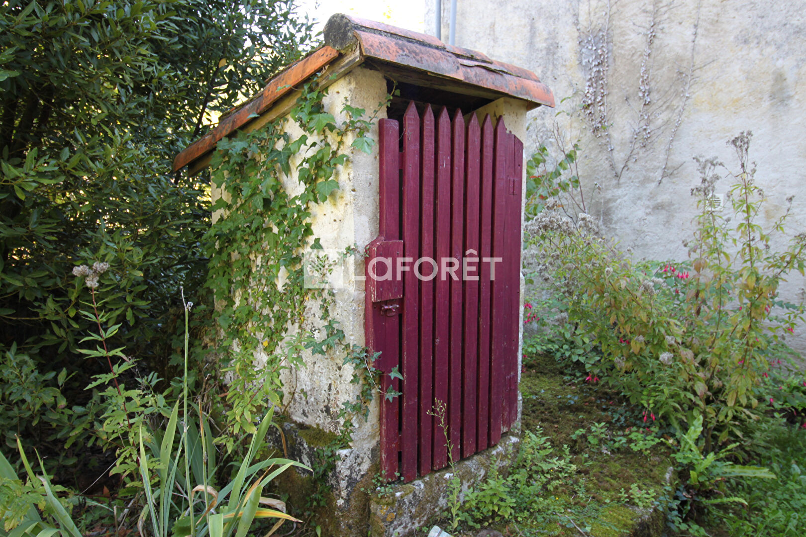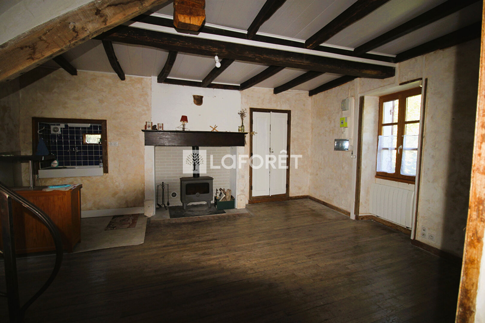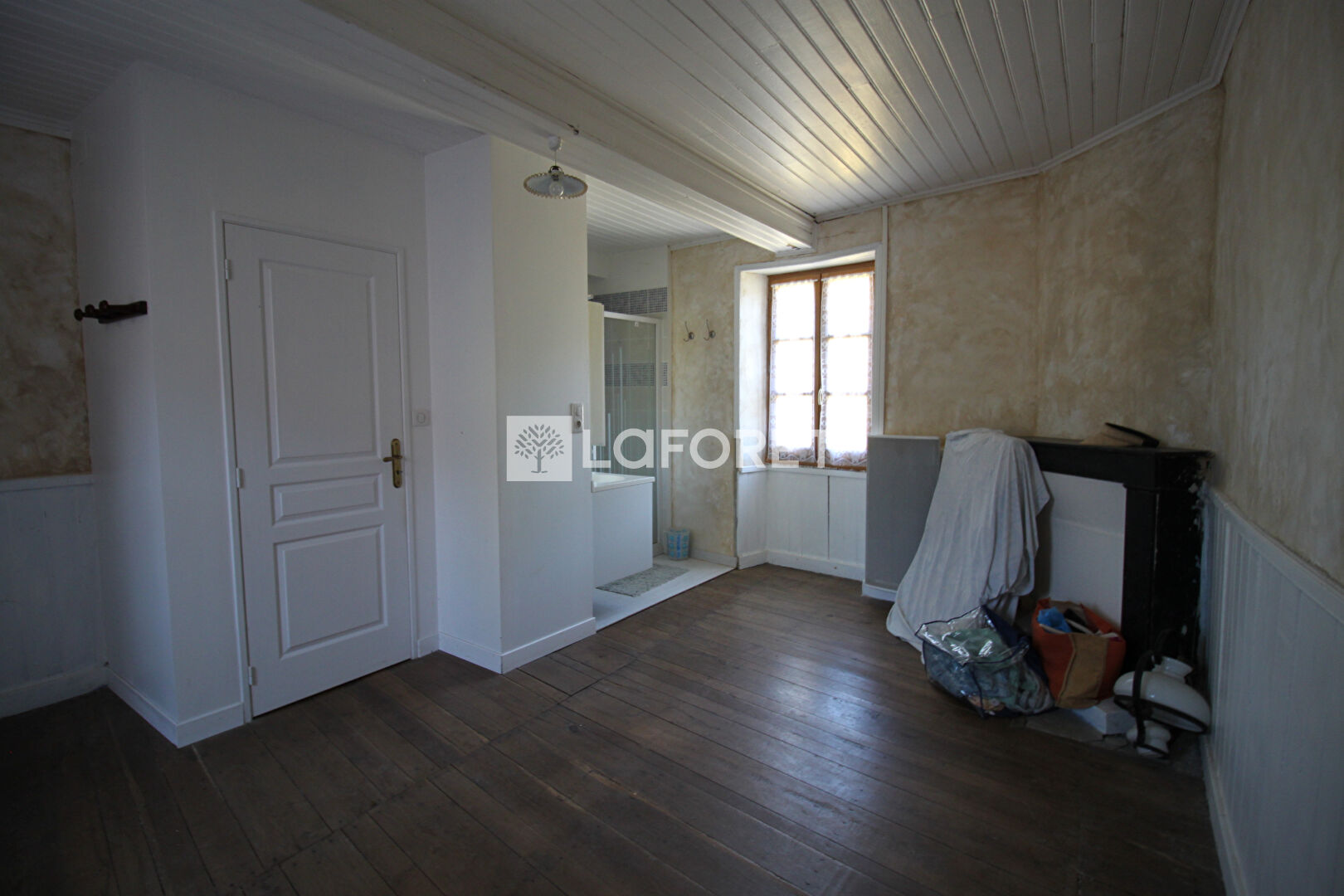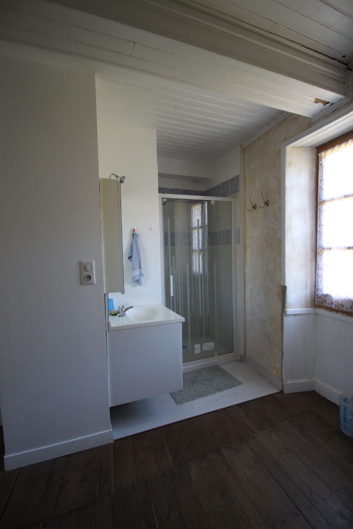 Une entrée donnant sur la cuisine / salle à manger avec une ancienne cheminée équipée d'un poêle à bois chauffant toute la maison. WC avec lave-mains, une première chambre avec salle d'eau et cheminée d'ornement.