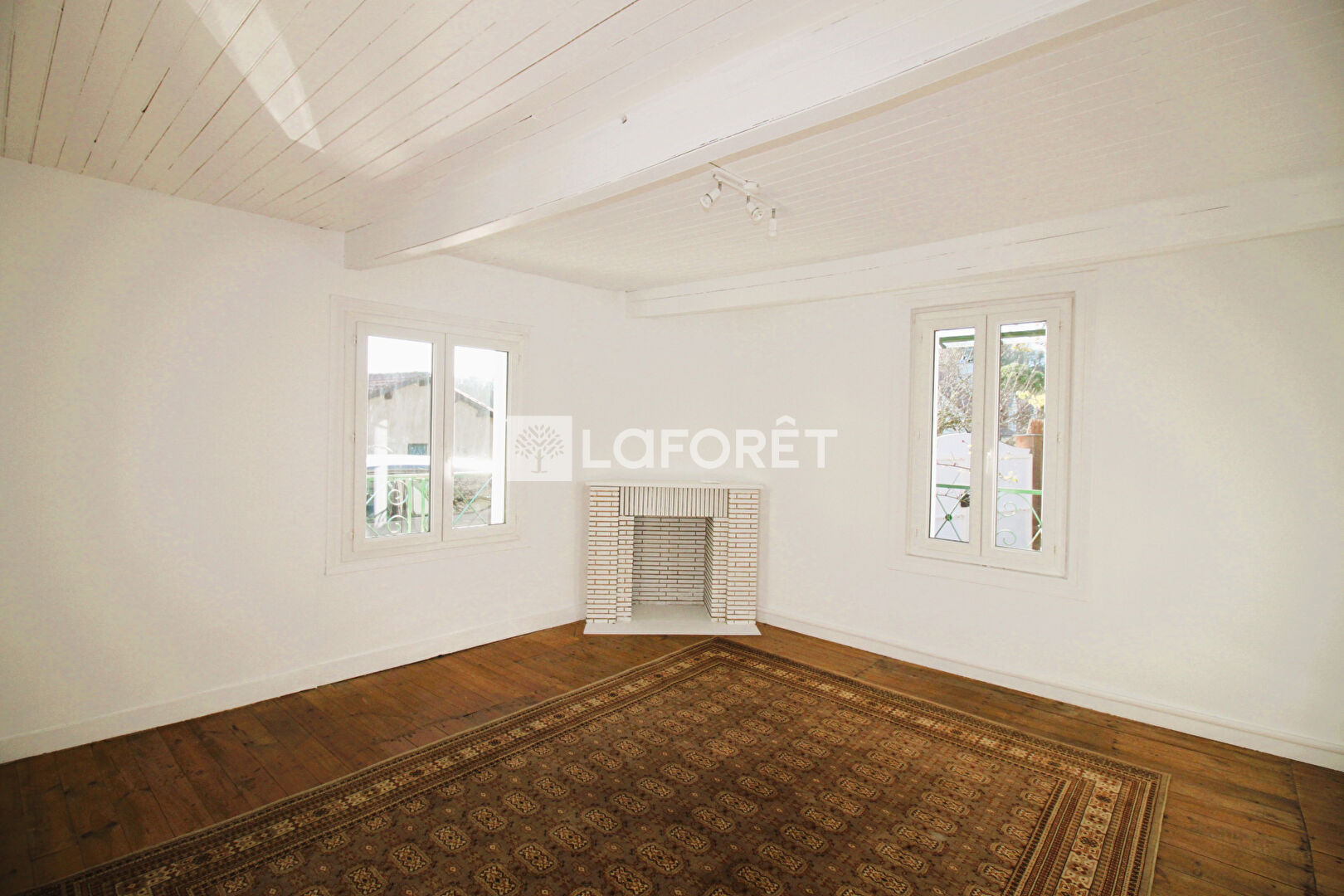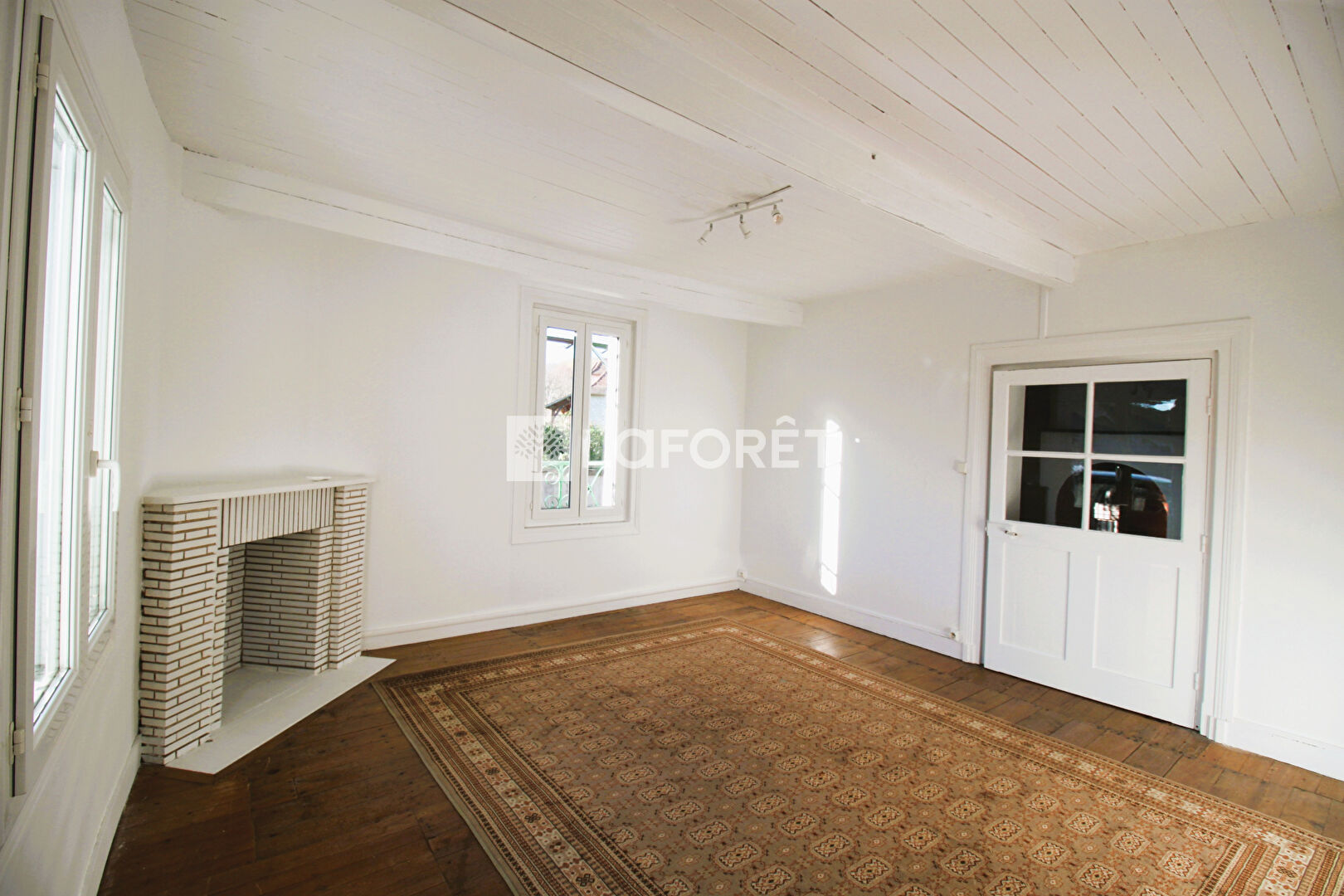 D'un côté, un salon d'environ 17.73m2 sur parquet ancien avec une cheminée foyer ouvert et deux fenêtres offrant une belle luminosité.