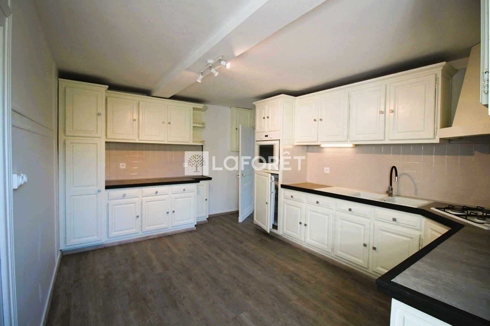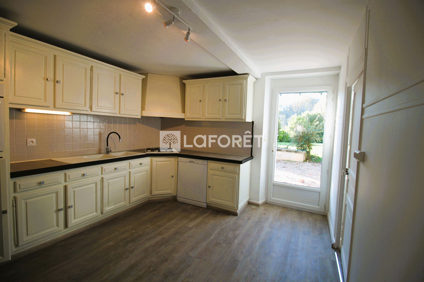 De l'autre côté, une cuisine fonctionnelle d'environ 14,71m2, aménagée de meubles hauts et bas, équipée d'un réfrigérateur encastré , d'une hotte, d'un four, d'une plaque de cuisson gaz 4 feux et d'un lave-vaisselle. Une porte permet l'accès au jardin.