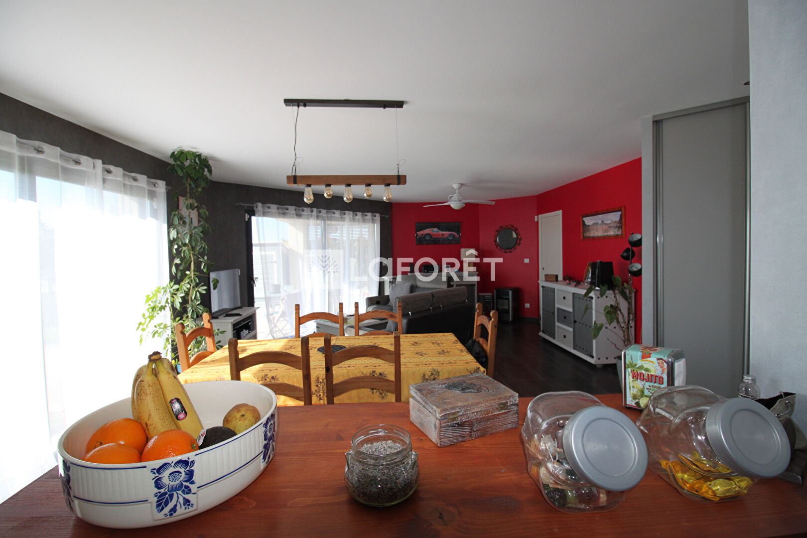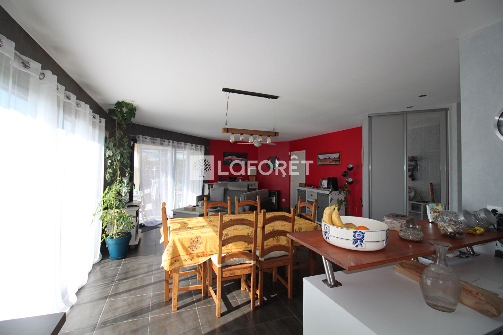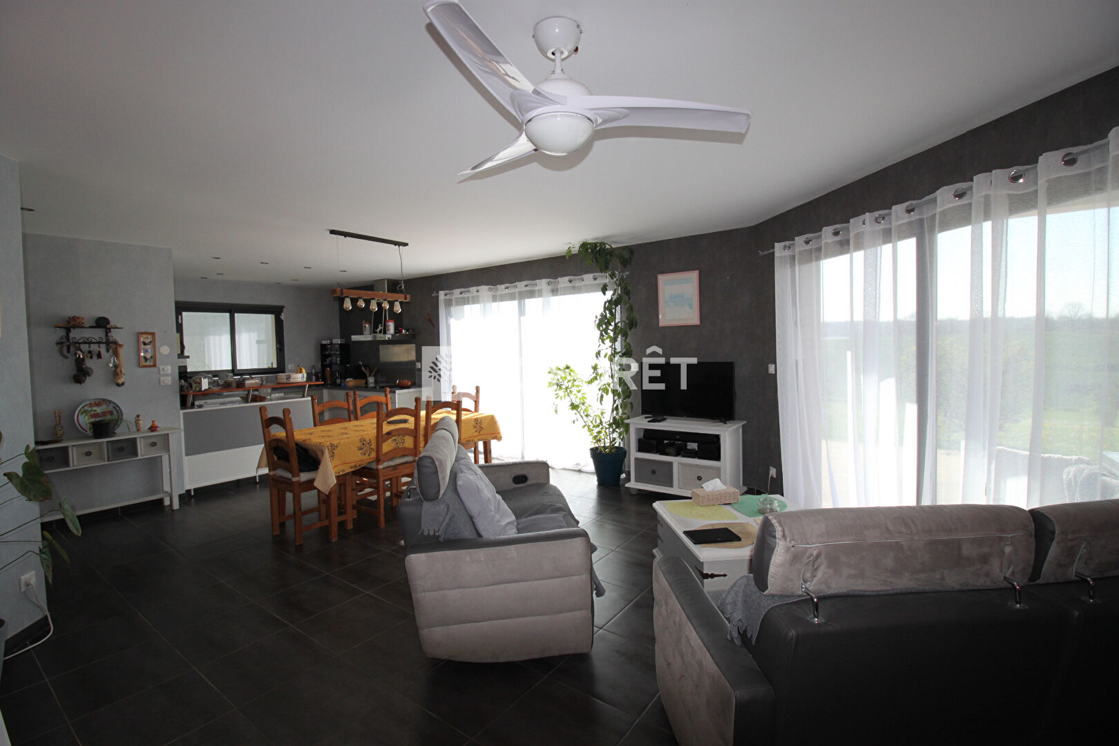 Vous découvrirez une entrée avec double placard ouvrant sur un séjour/salon d'environ 42 m² baigné de lumière, grâce à deux grandes baies vitrées donnant accès à une agréable terrasse, en partie couverte, située à l'arrière de la maison avec une vue dégagée sur la campagne.