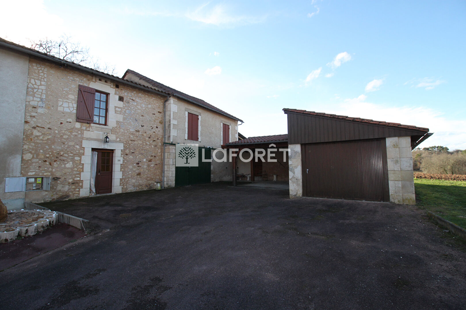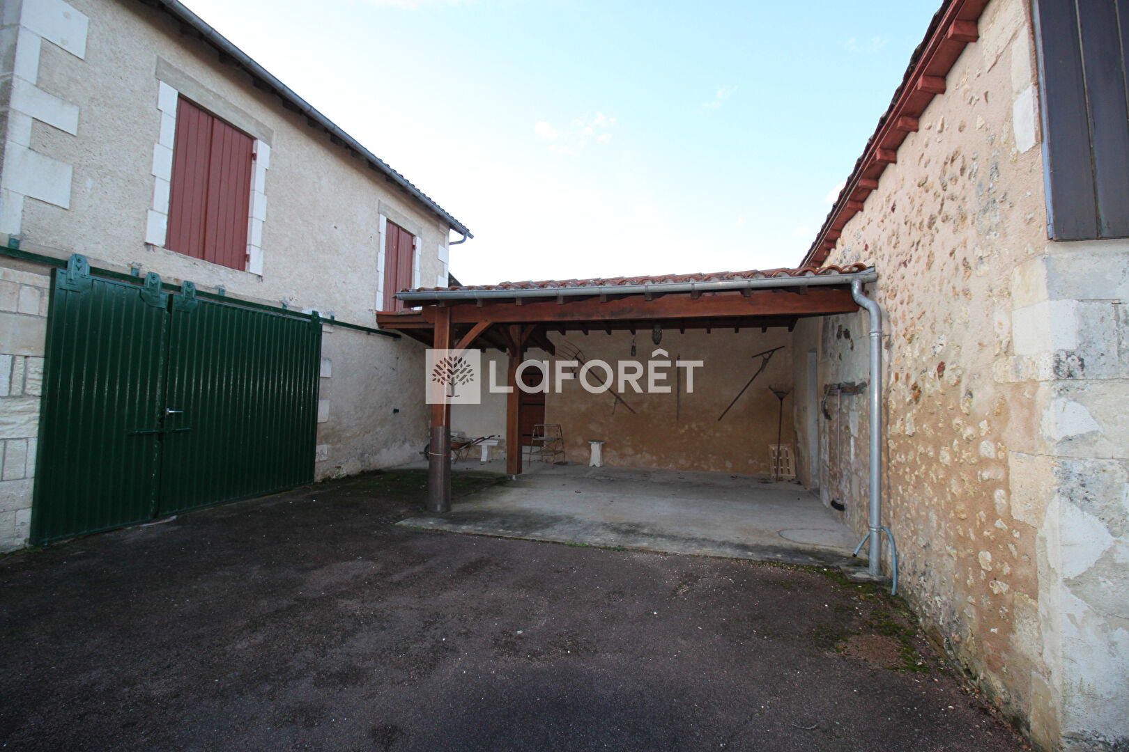 À l'extérieur, une grande cours bitumée, un préau d'environ 22 m² et un garage fermé d'environ 20 m².