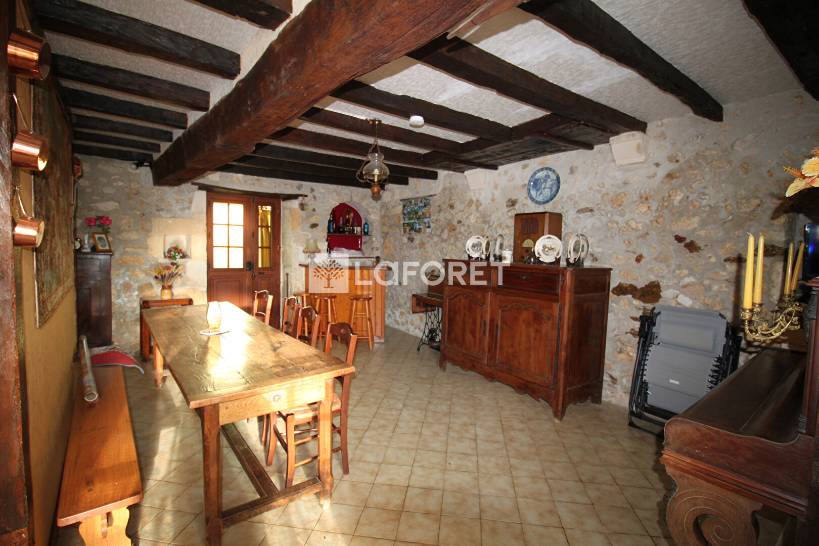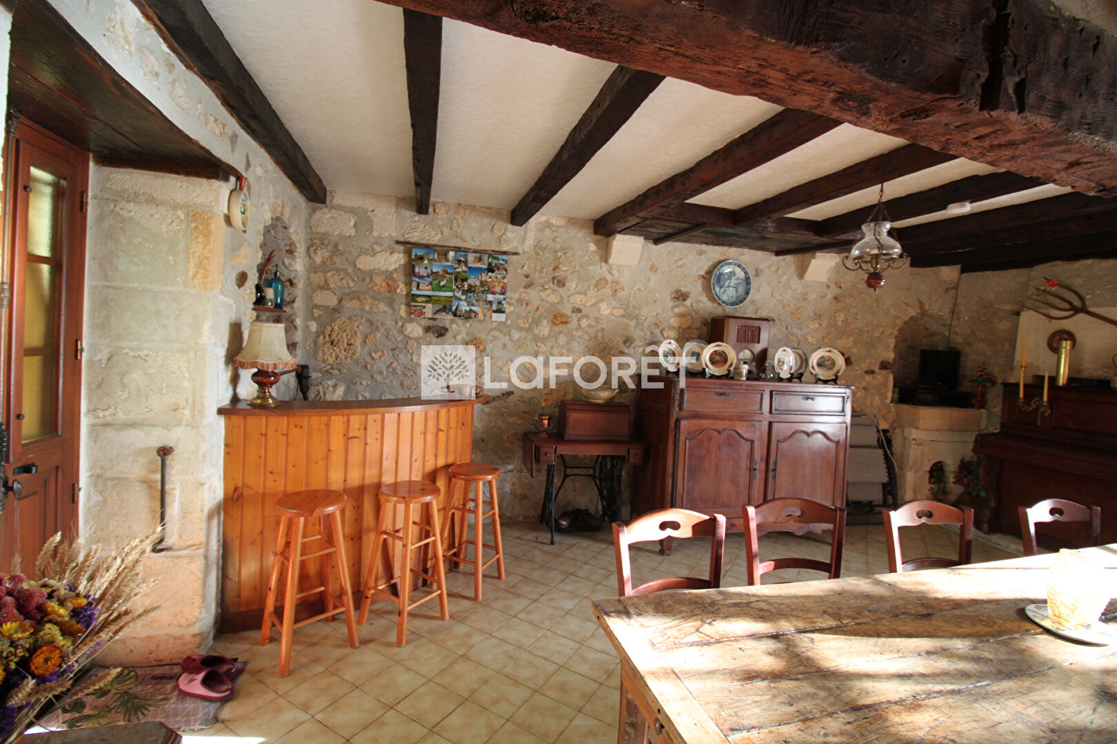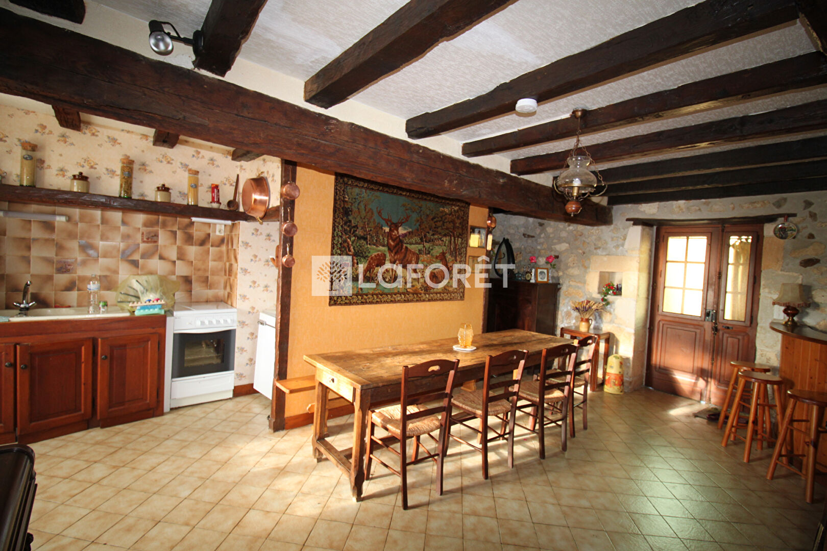 Entrée sur séjour- salle à manger avec cuisine ouverte d'environ 22 m², alliant évier et cheminée en pierre et poutres apparentes.