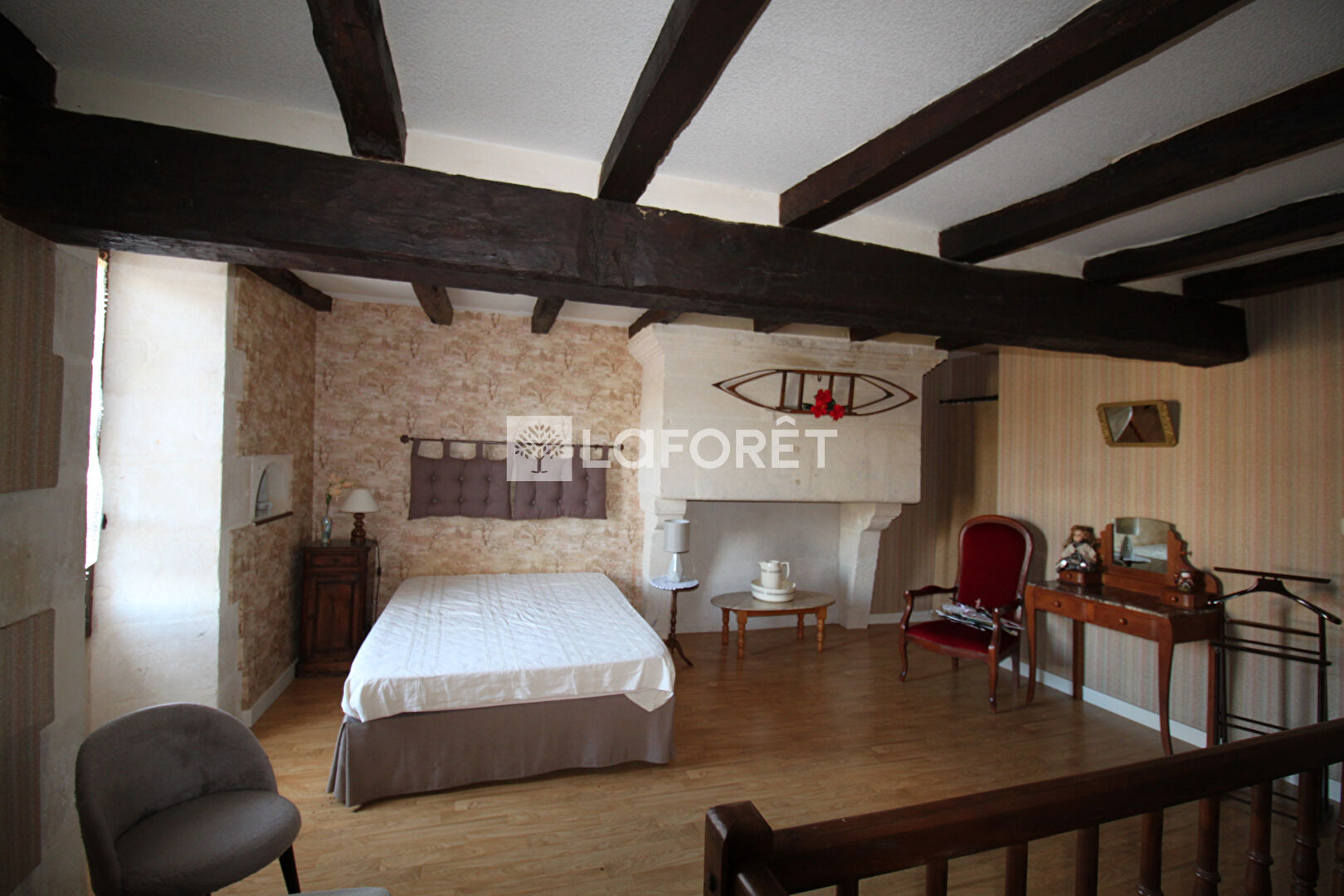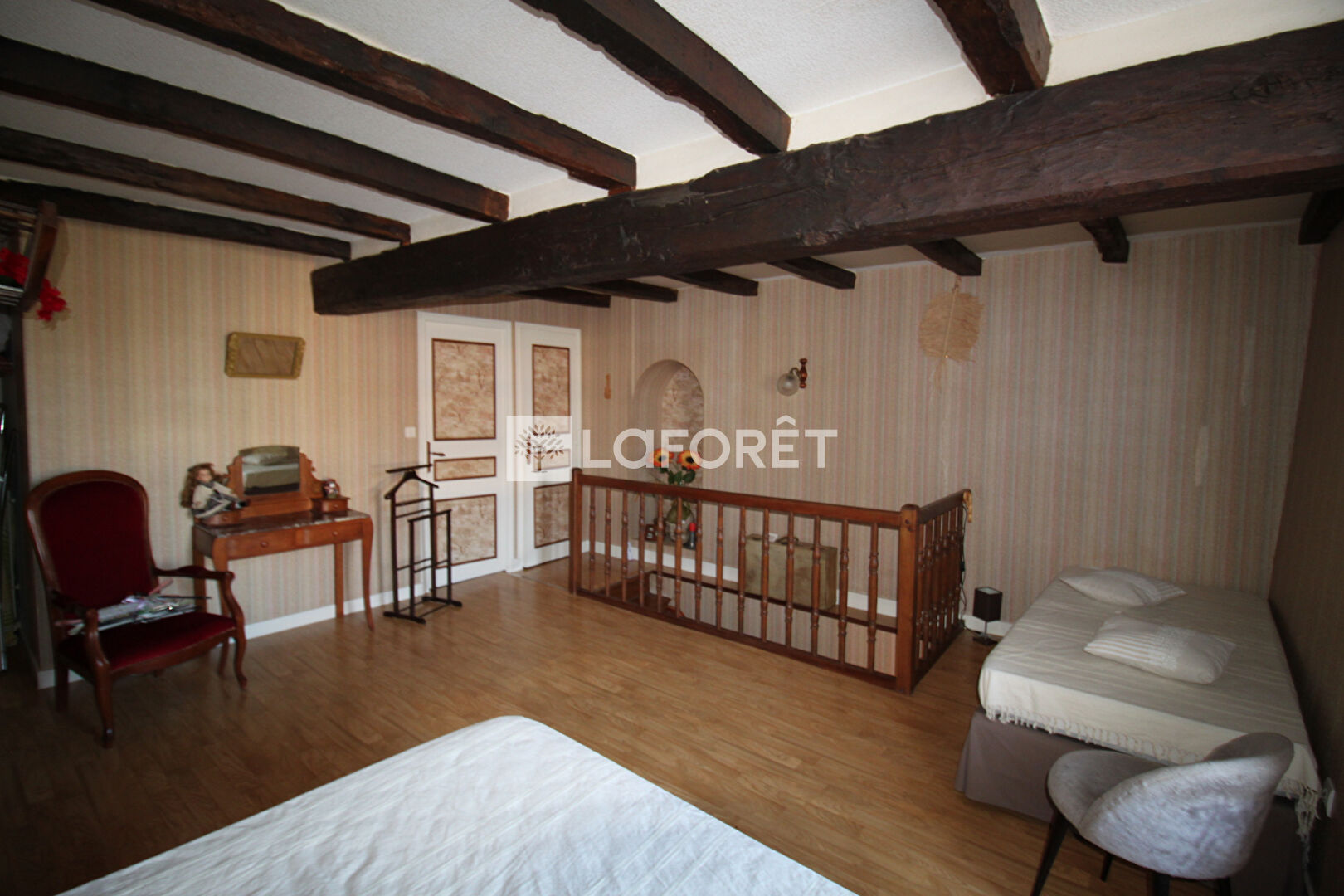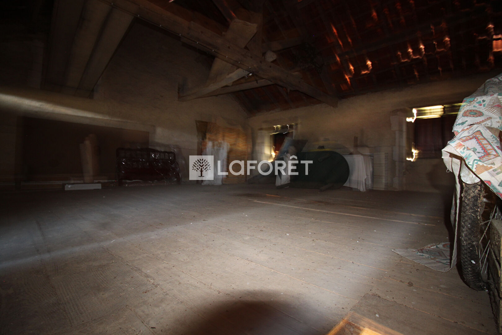À l'étage, une grande chambre, sous poutres également, d'environ 20 m². Une salle d'eau d'environ 4 m² et un WC d'environ 1m². Combles d'environ 20 m² aménageables.