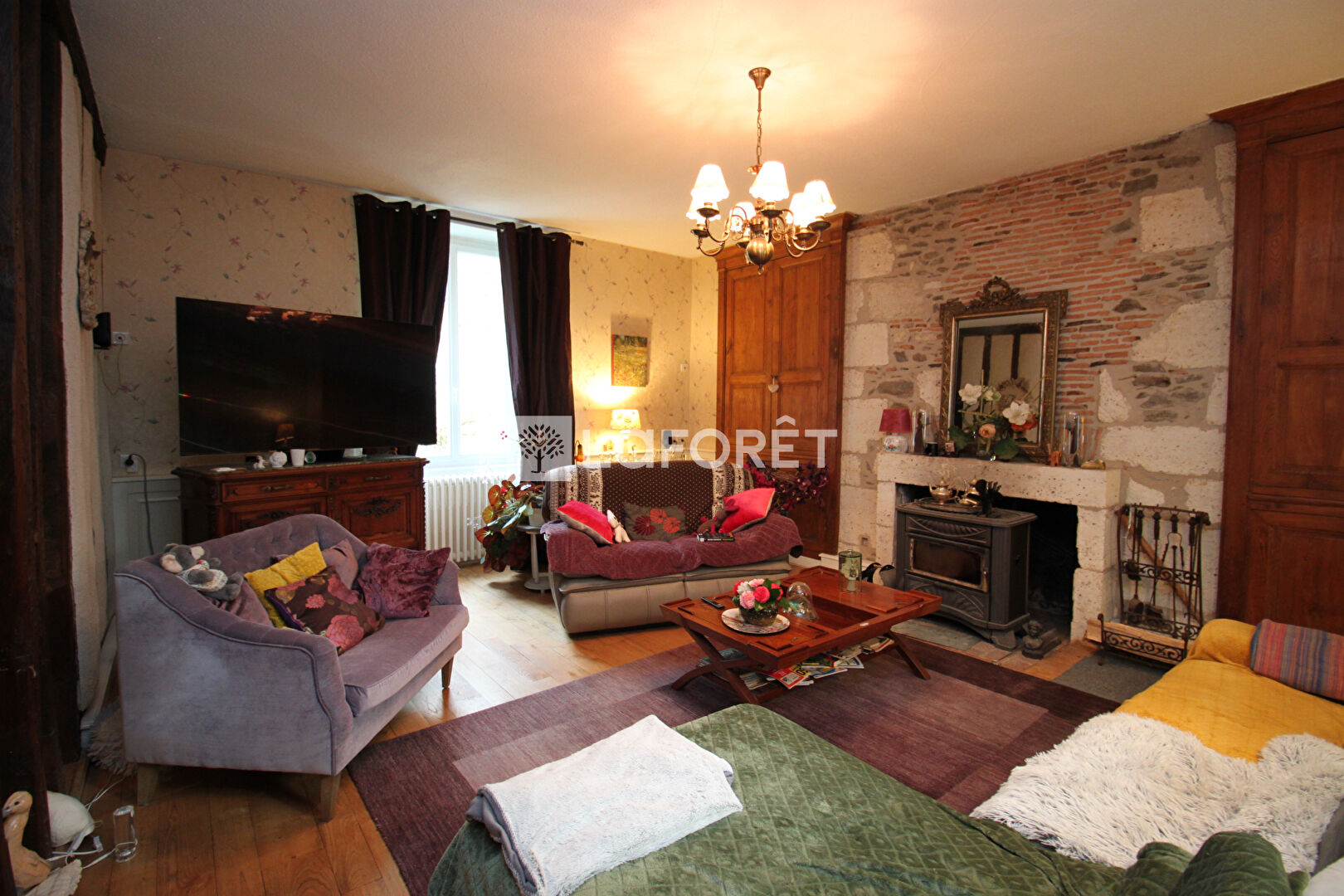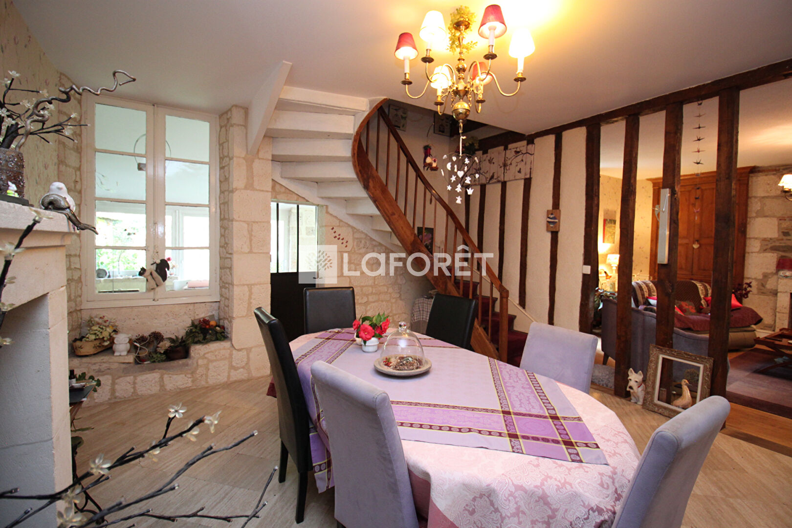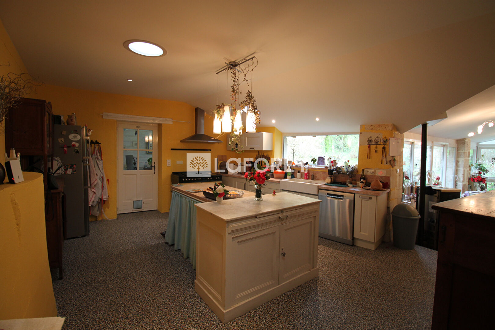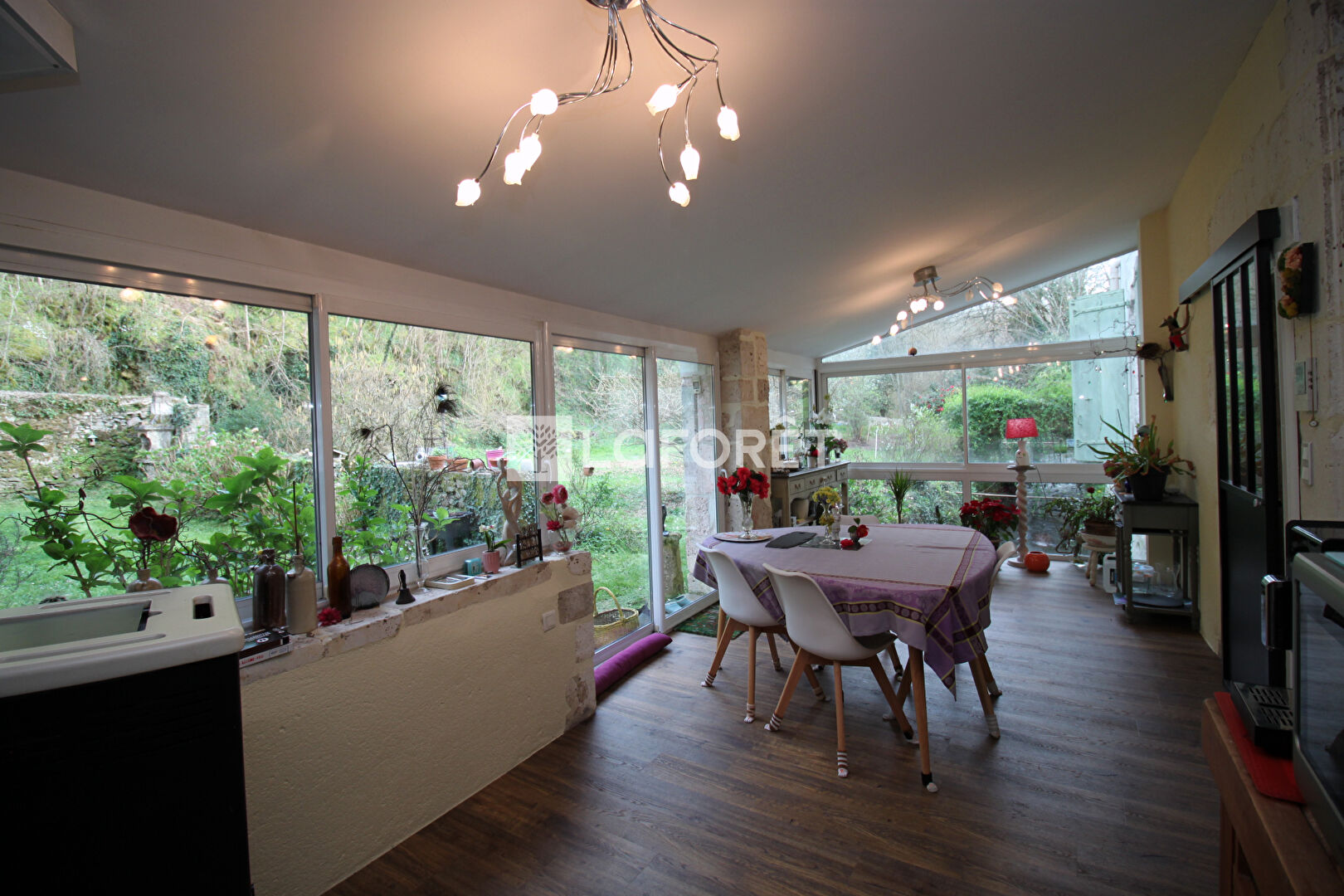 Rez-de-chaussée : Un sas d'entée vous accueil, salle à manger d'environ 23m², sol en travertin, poutres, agrémentée d'une cheminée foyer ouvert ; Salon d'environ 30m² sur parquet en châtaigner, cheminée aménagée d'un poêle à bois ; Une porte atelier sépare la cuisine d'environ 45m² aménagée en L avec un coin repas très agréable dans une verrière qui donne au dessus du cours d'eau "Le Bief" , vue sur la nature; bureau; en enfilade petit atelier ;