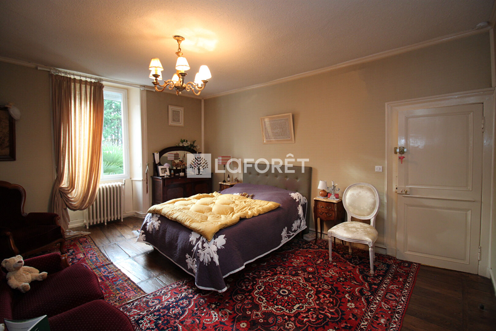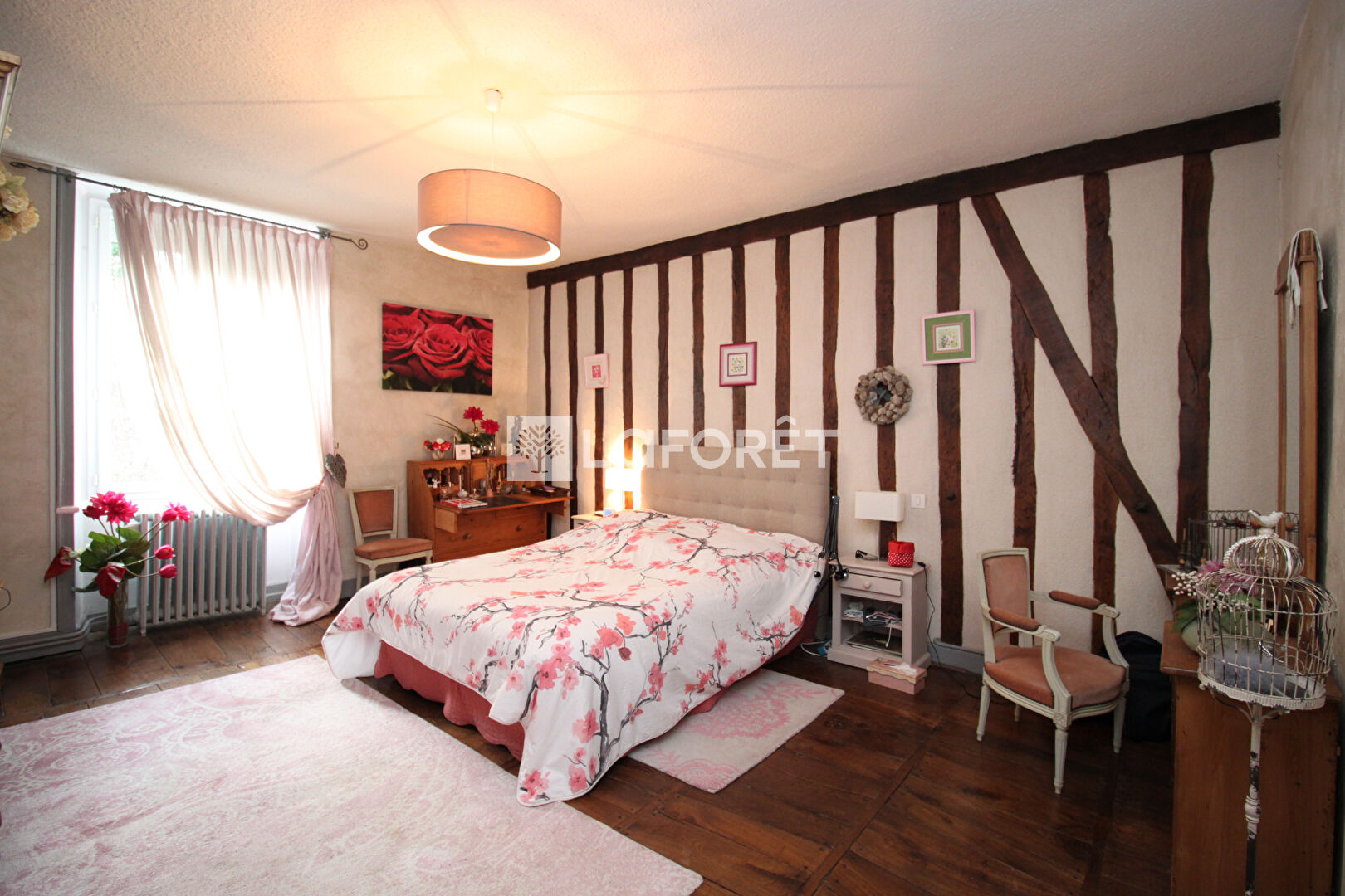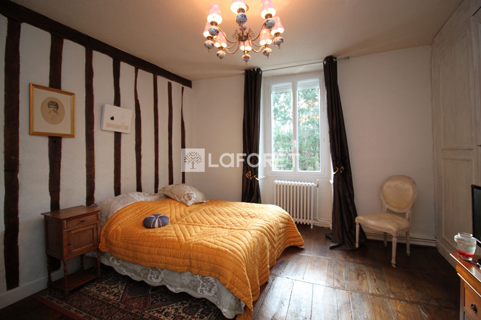 Etage au dessus du séjour: un pallier distribue 1 chambre sur parquet ancien d'environ 18m², poutres; WC avec lave-mains; 2 chambres parentales d'environ 23m² à 27m², salle d'eau chacune avec WC; l'escalier donne aussi accès au grenier d'environ 83m² qui peut être aménagé.