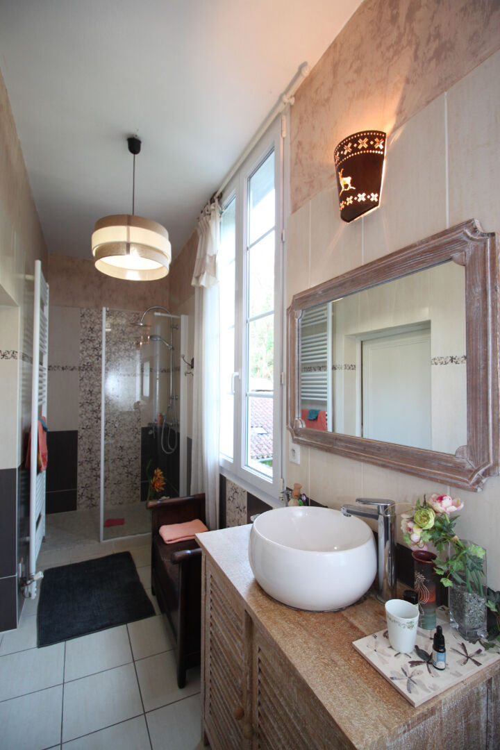 Chambre parentale avec salle de bain, meuble 2 vasques baignoire balnéo, douche à l'Italienne; WC avec lave-mains;